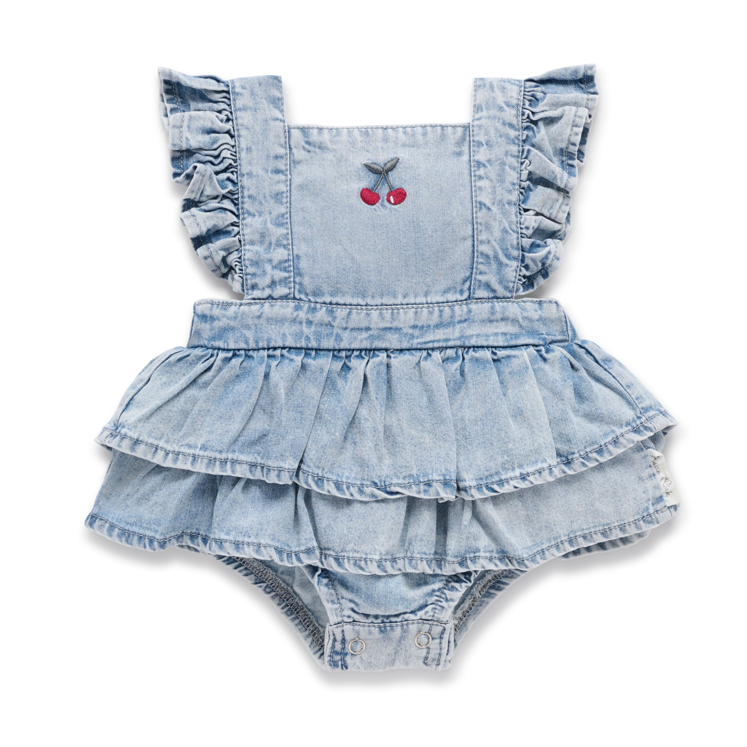 Embroidered twin cherries on the chest add a pop of sweetness, while crossover straps at the back ensure a secure, stay-put design. Perfect for park days, picnics, and special occasions!