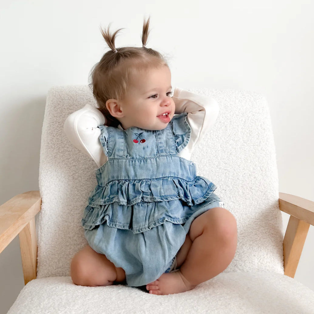 Made from lightweight, breathable Tencel denim, this gorgeous ruffle playsuit is as gentle on delicate skin as it is on the planet. With playful ruffles and oversized fit, it blends vintage charm with comfort for carefree and comfortable days in the sun.