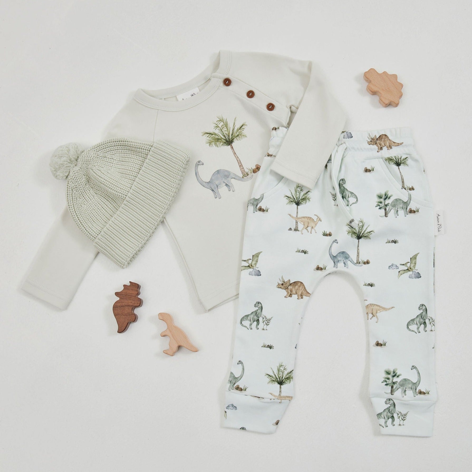 Aster & Oak's Dinosaur Print Top is crafted from GOTS-certified organic cotton for ultimate comfort and breathability and features buttons to the neck for easy changes. Pair with the matching dinosaur harem pants and beanie for the ultimate outfit that is sure to be your little one's favourite this season!