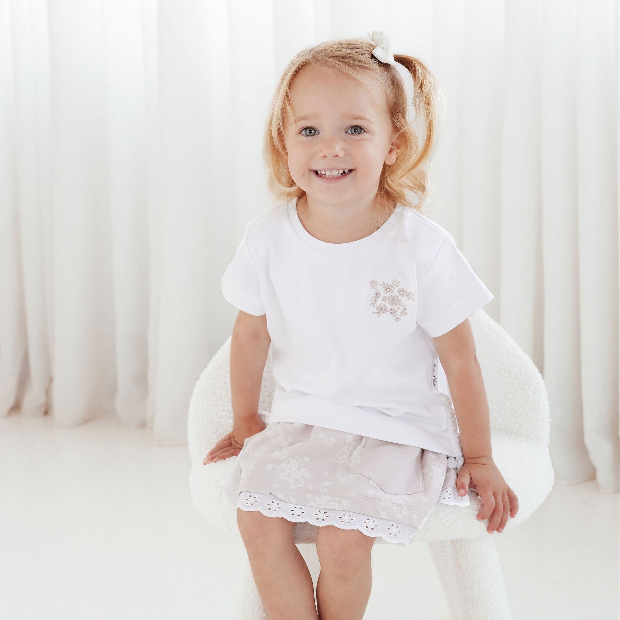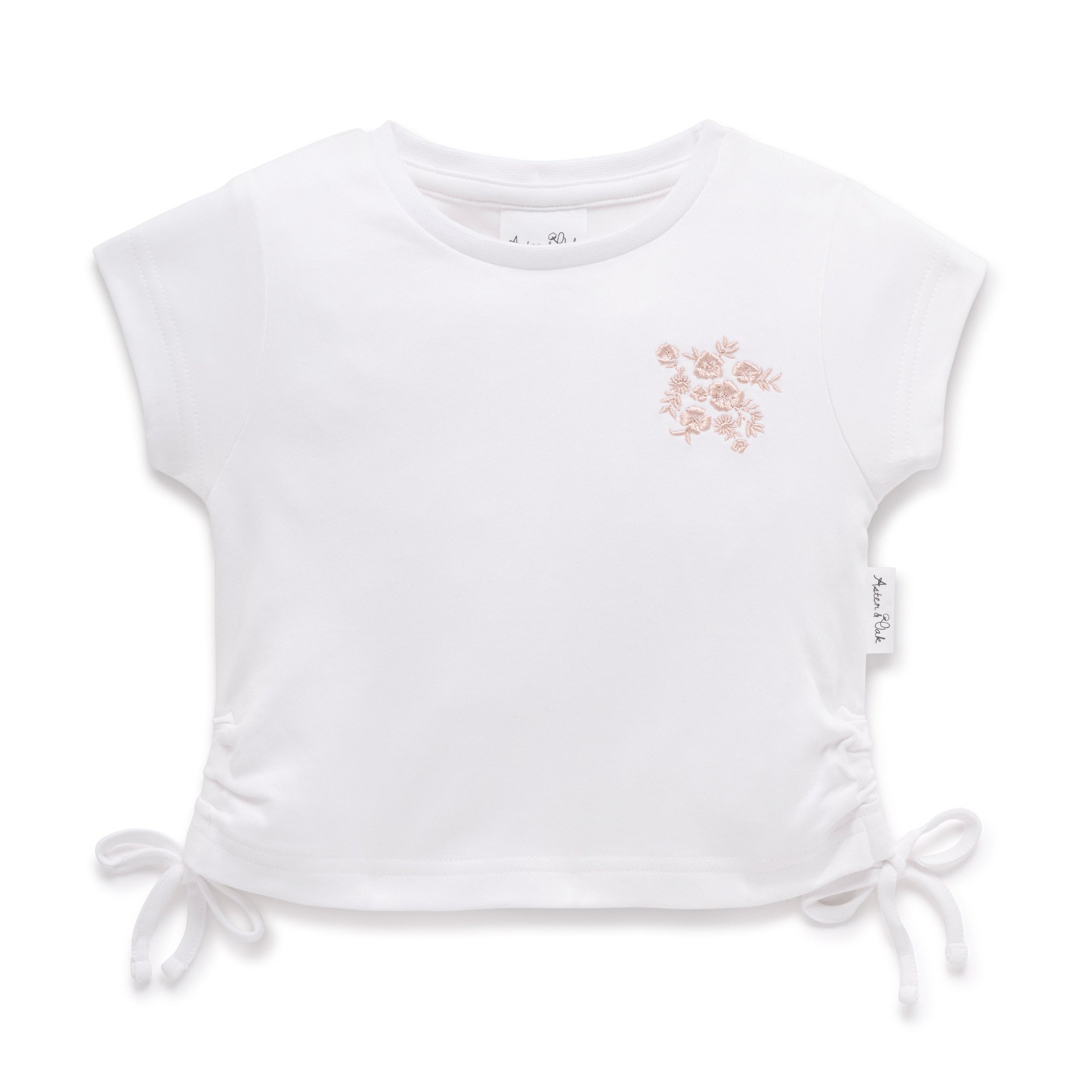 Made from super soft certified organic cotton, this simple yet sweet design features draw string ties to sides for an adjustable and fun fit, a classis white tee elevated by design and small embroidered florals!