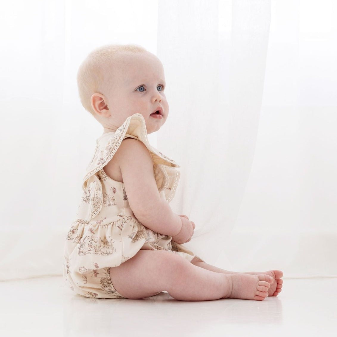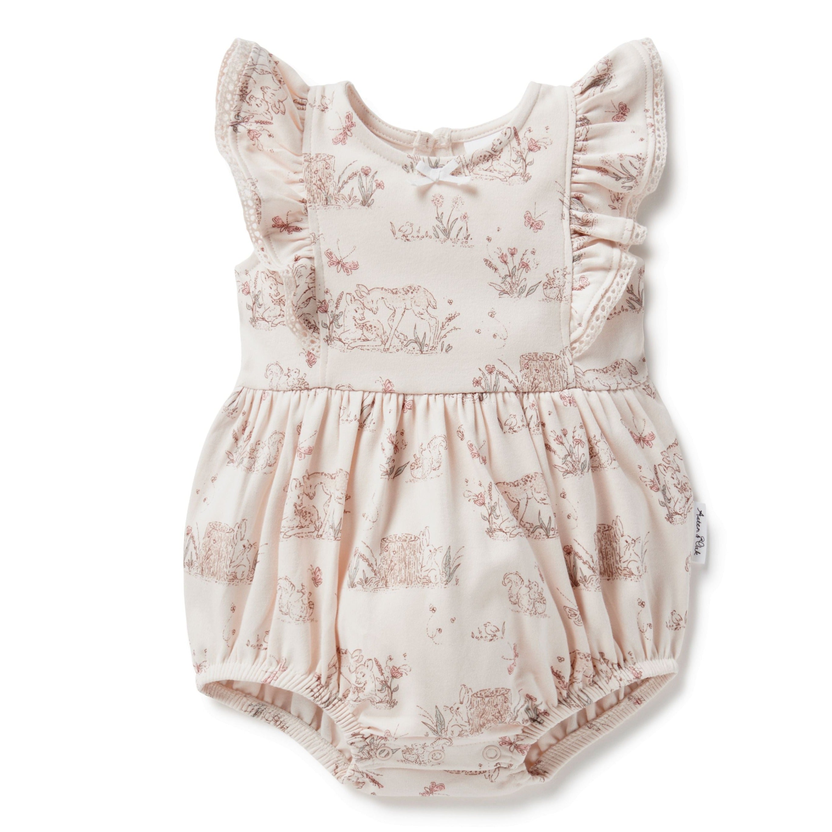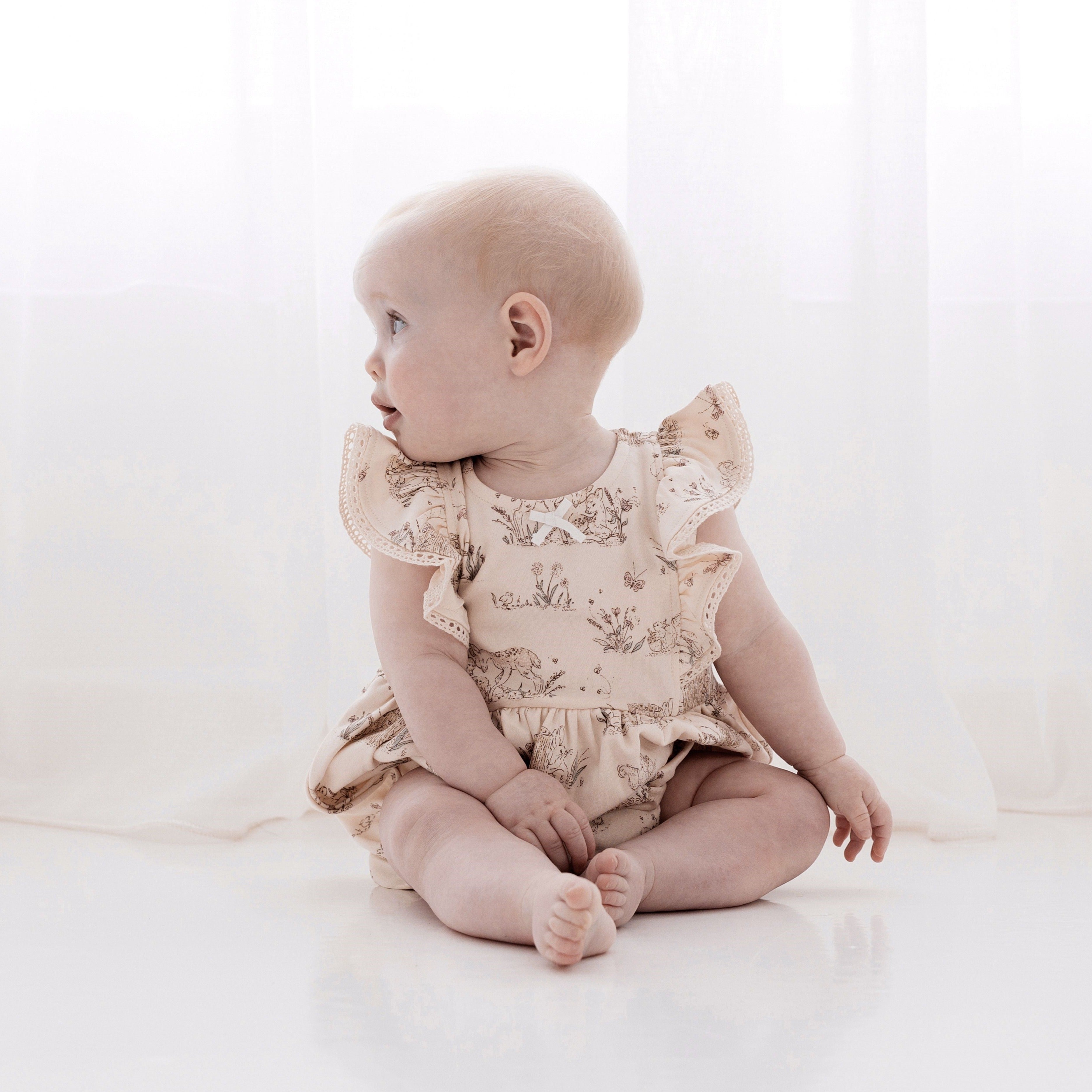This sweet bubble romper is beautifully soft and features a hand-drawn fawn meadow design on a natural background. Perfect for special occasions and everyday wear, it features stunning lace edging on the ruffles, a sweet bow and bottom snaps for convenient changes.