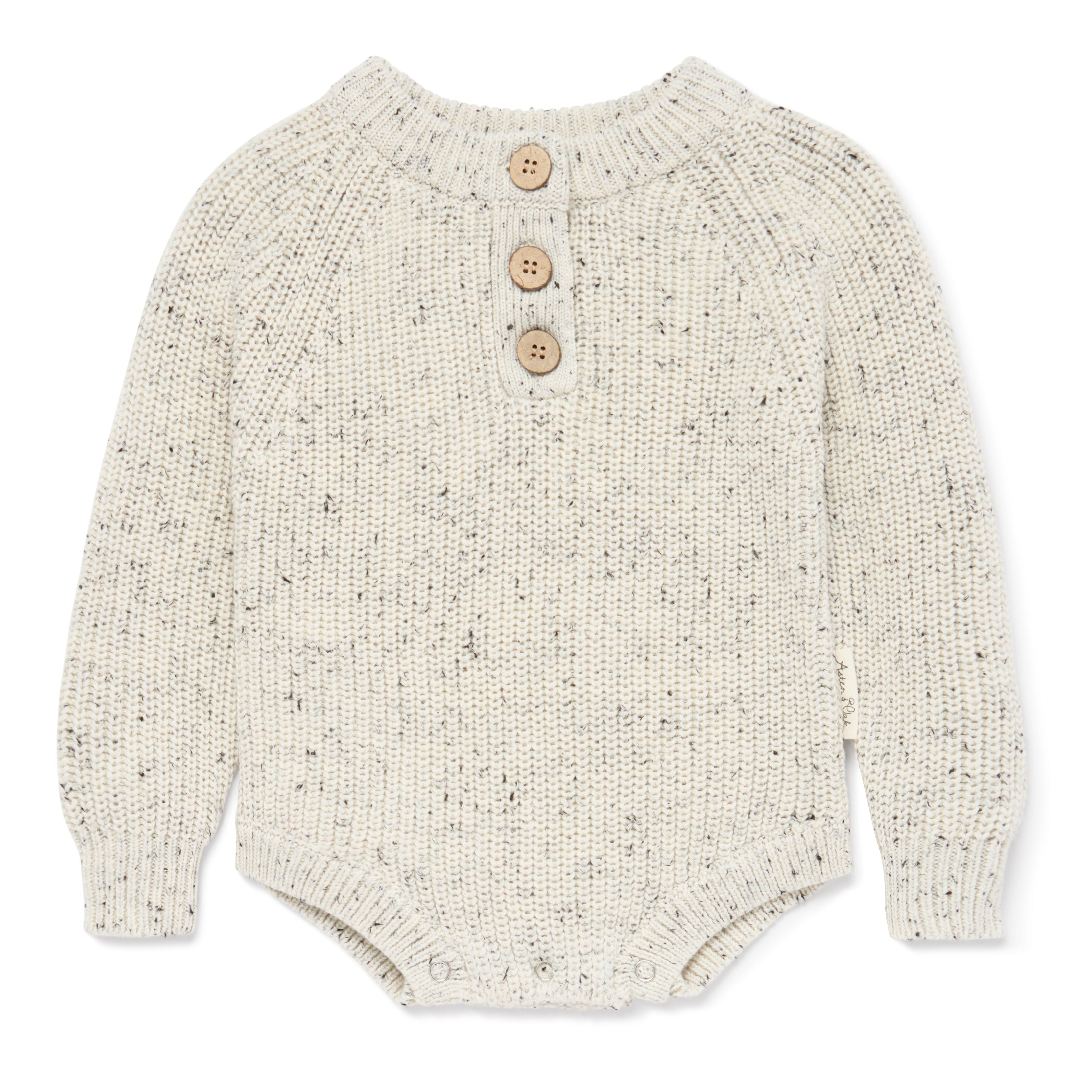 Aster & Oak gorgeous Natural Fleck Knit Romper features a henley neckline with coconut buttons and snaps along the crotch for easy changes. It is a classic style for your little one's winter wardrobe!