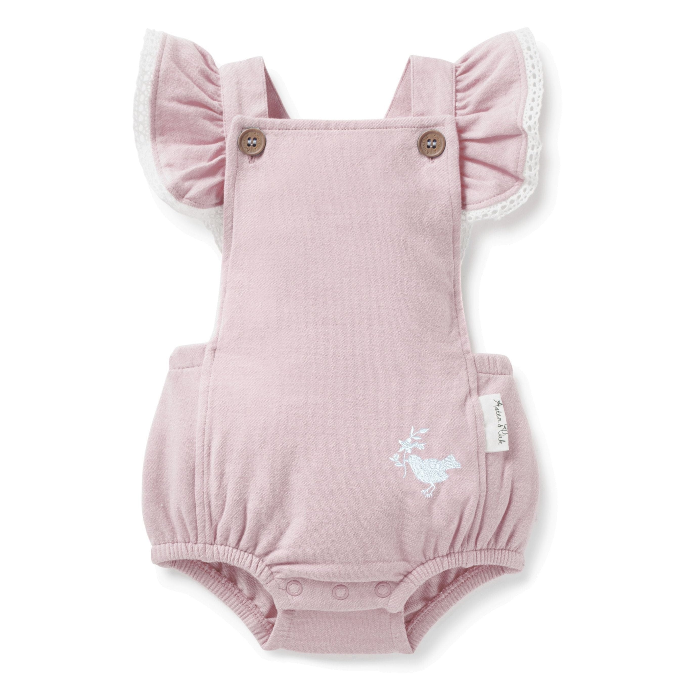 Aster & Oak's Pink Chambray Ruffle Playsuit features beautiful, ruffled shoulders with crochet lace detailing and sweet bird embroidery on the front.