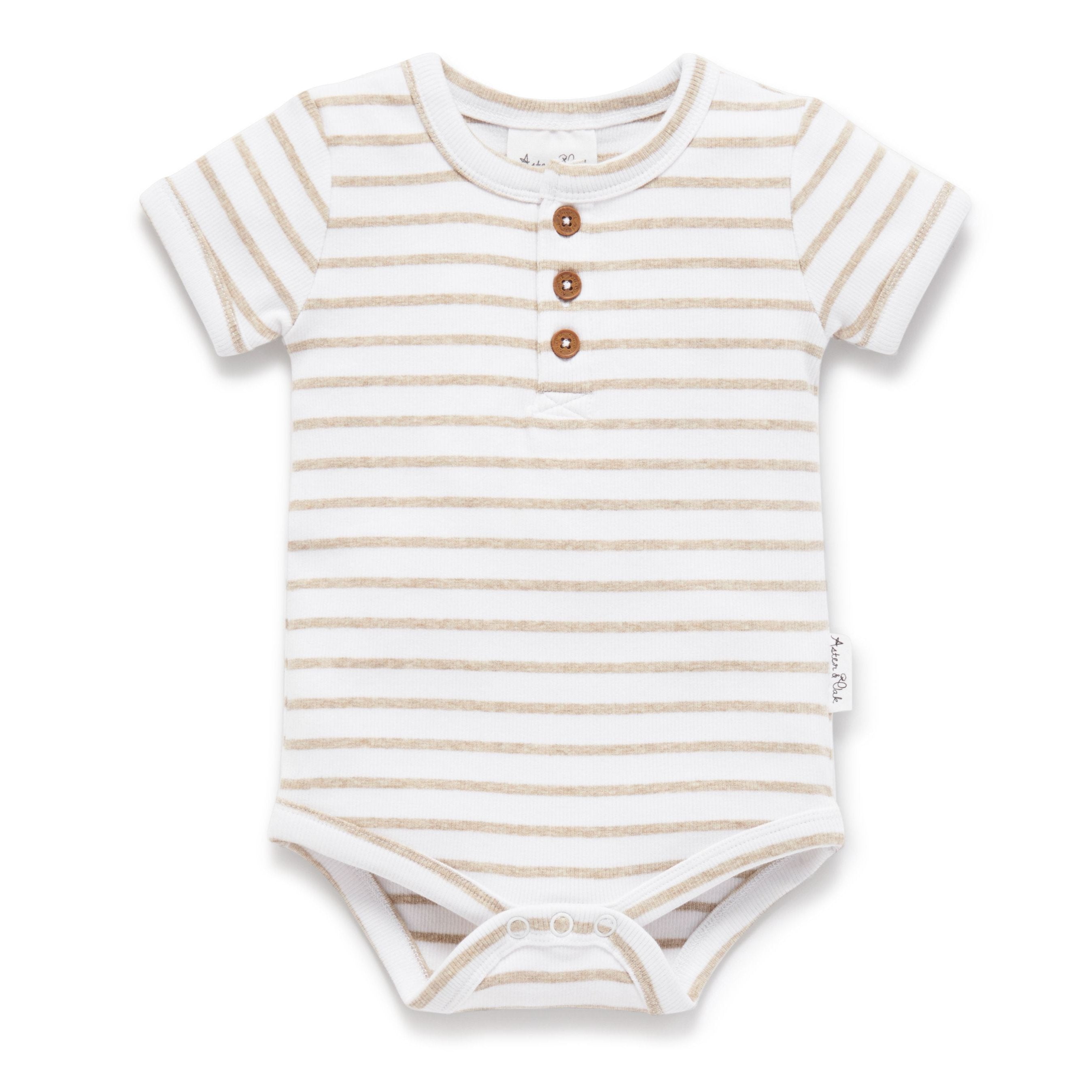 An essential for any wardrobe with its neutral and classic style, the Stripe Rib Henley Onesie is made in a soft and stretchy organic cotton rib. Featuring wood look buttons to the neckline and premium YKK snap buttons to the bottom for easy changes, this onesie paired with the Oatmeal Knit Shorts makes for a cute ensemble!