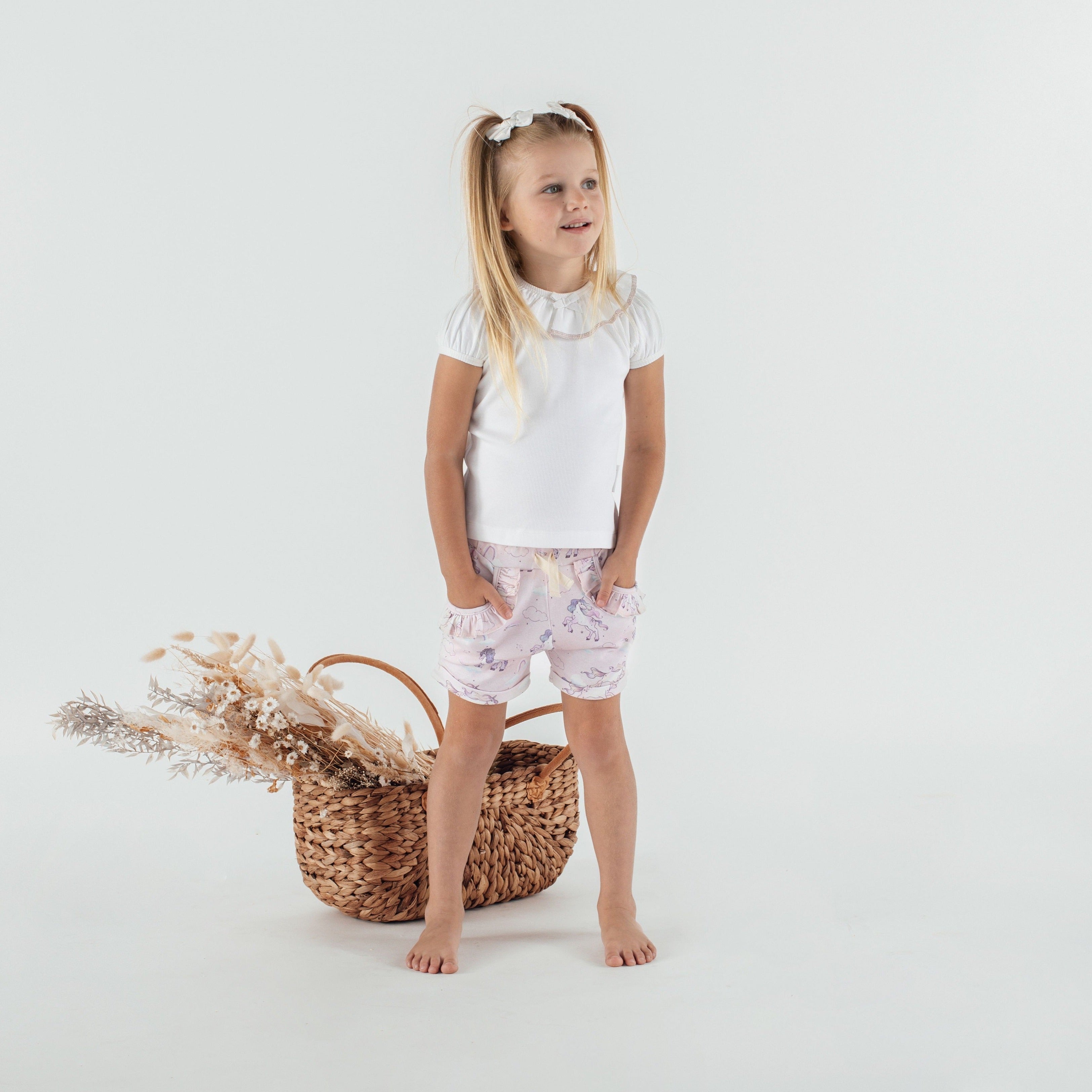 Aster & Oak Unicorn Ruffle Shorts are a new style for the season and one we can guarantee your little one will want to wear all summer long! Made from 100% organic cotton and featuring fully functional pockets with cute ruffles; these shorts are sure to keep those special little treasures safe.