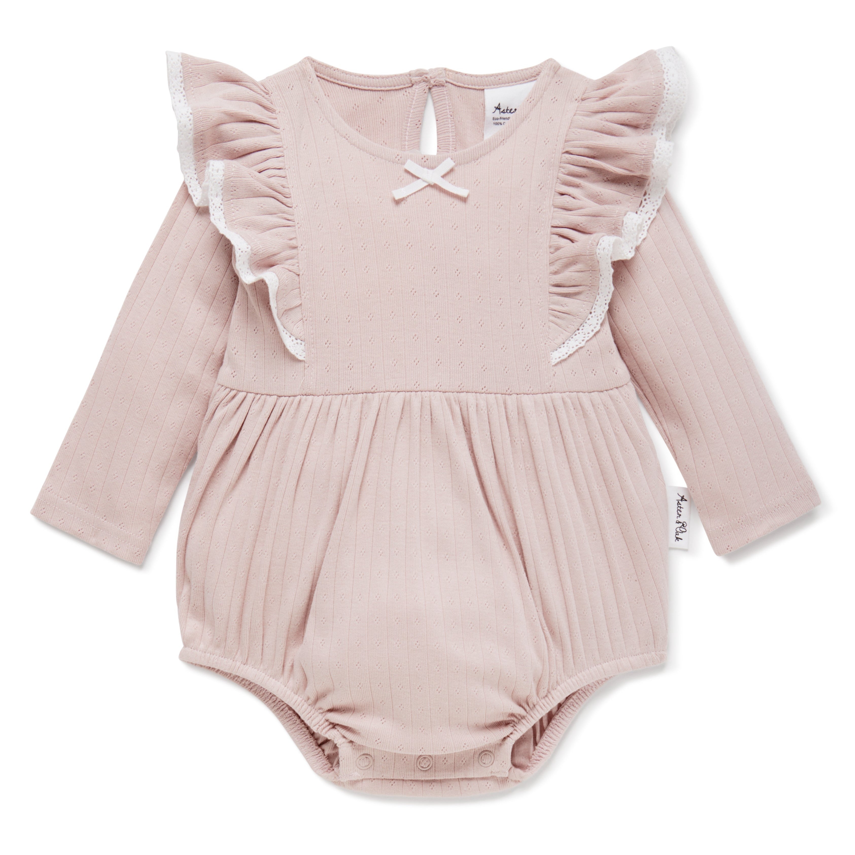 Your little one will be super comfortable in this vintage inspired piece, perfect for special occasions and everyday wear. The Violet Ice Bubble Romper is crafted from 100% organic cotton, in a soft mauve pink colour and features stunning crotchet lace edging on the frills, with a sweet bow.