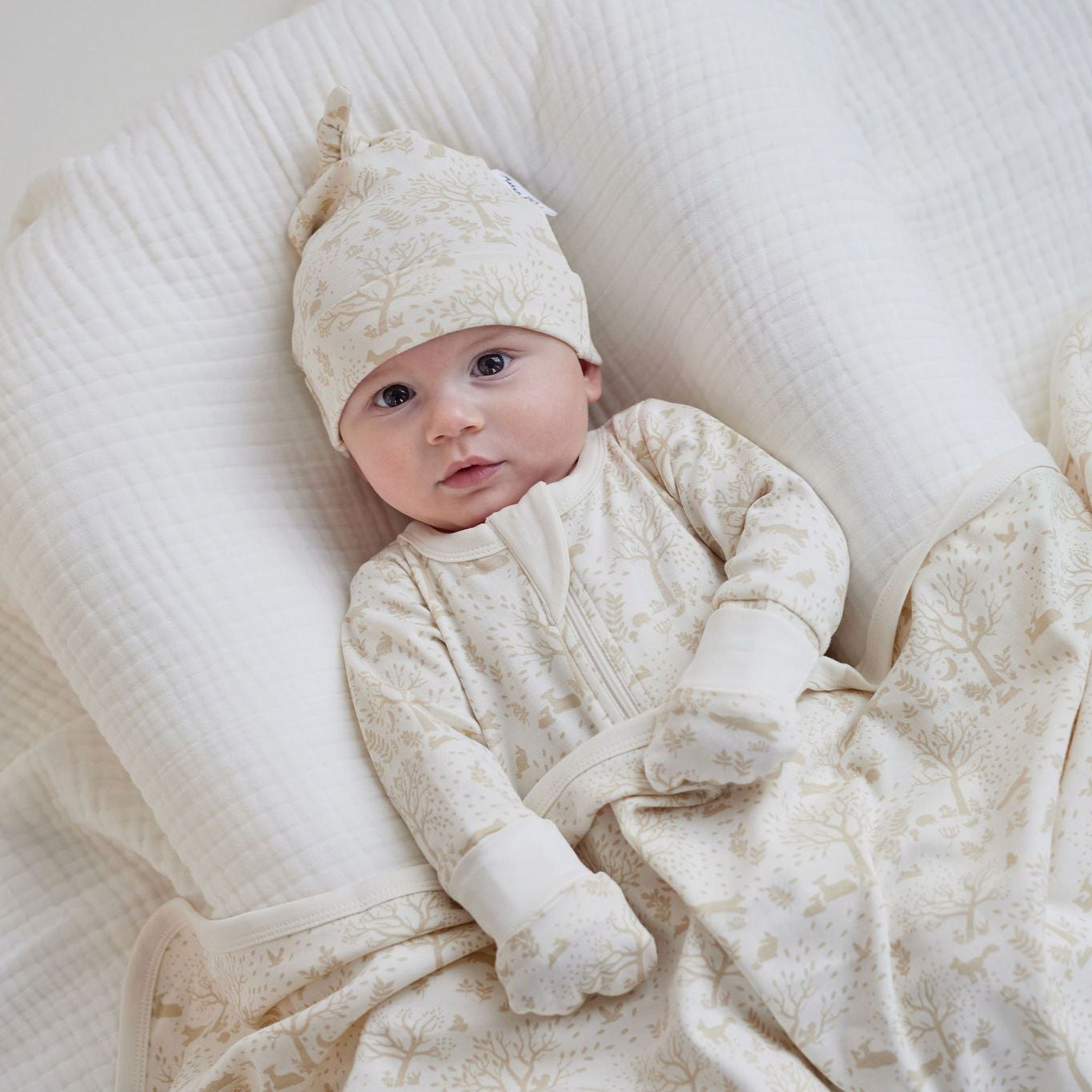 Featuring a calming woodland print in natural, earthy tones, this unisex baby zipsuit is designed with comfort and practicality in mind. A protective zip backing and fabric cover prevent snags and irritation, while the premium two-way YKK zipper makes changes a breeze – especially during nighttime.
