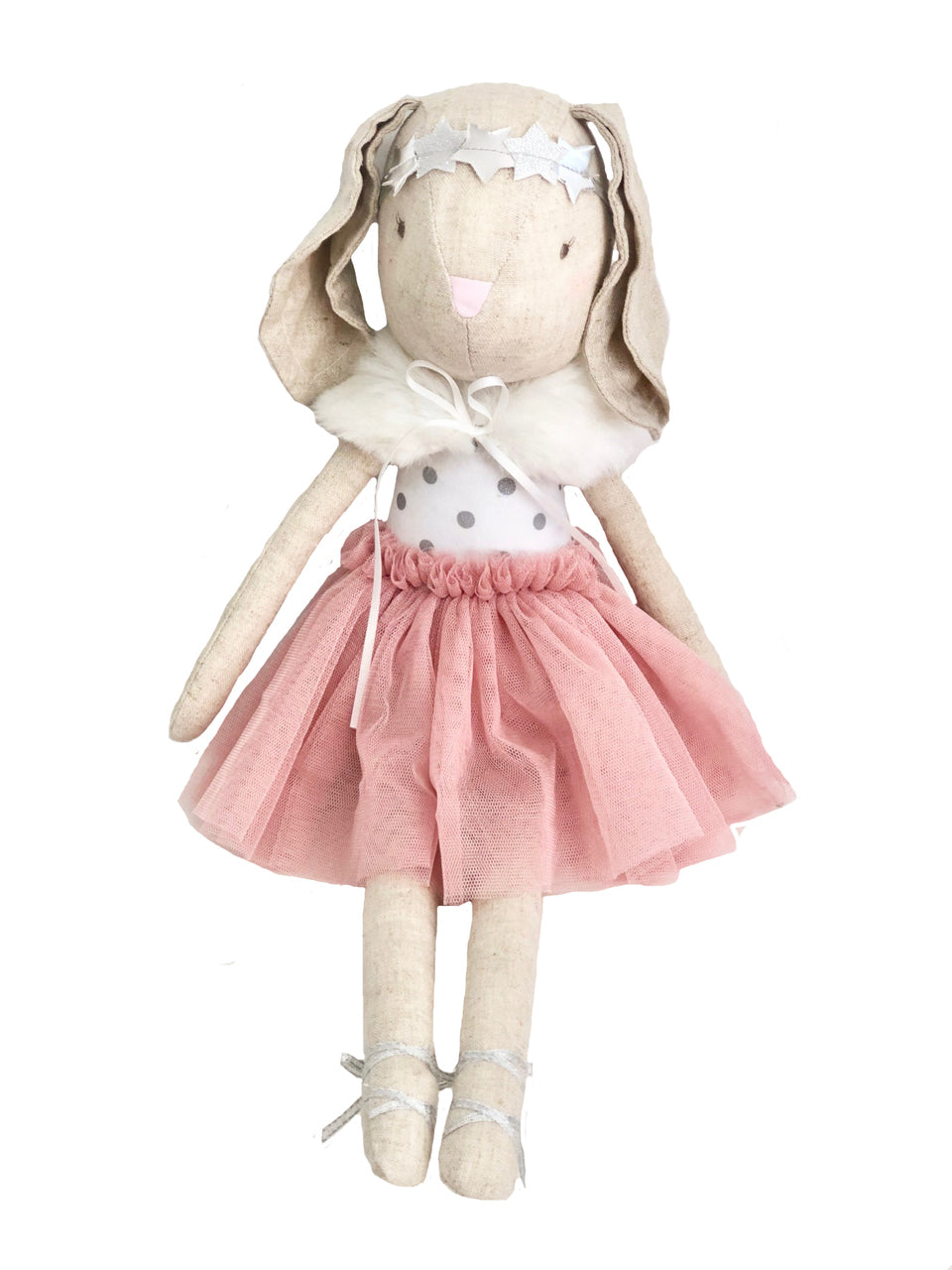Blair bunny with her faux fur capelet loves her shiny silver star headband and fluffy blush tulle tutu with silver spots bodice. Suitable from 3 years.