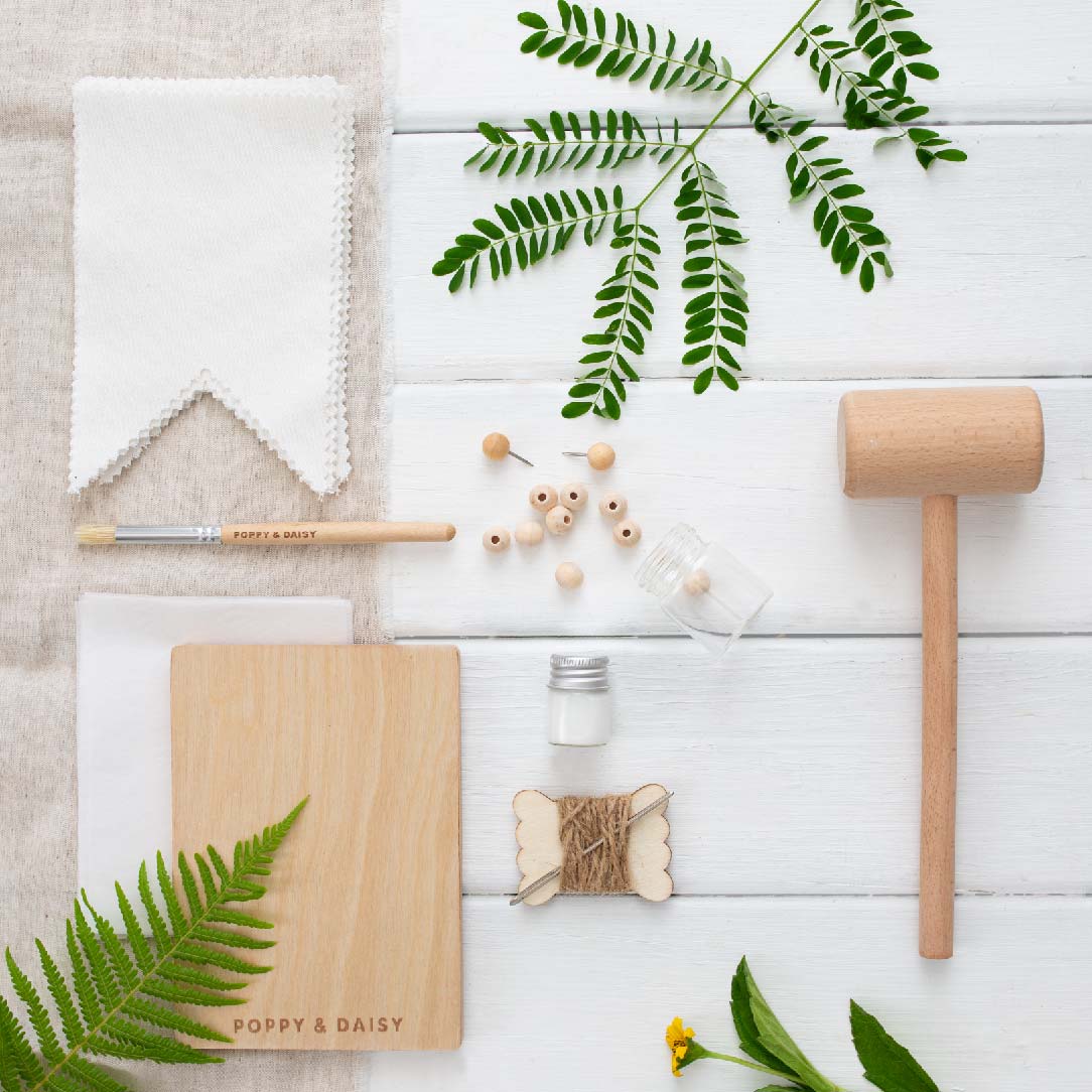 Hammer your designs onto cute organic cotton flags and hang up your wonderful work for all to admire!