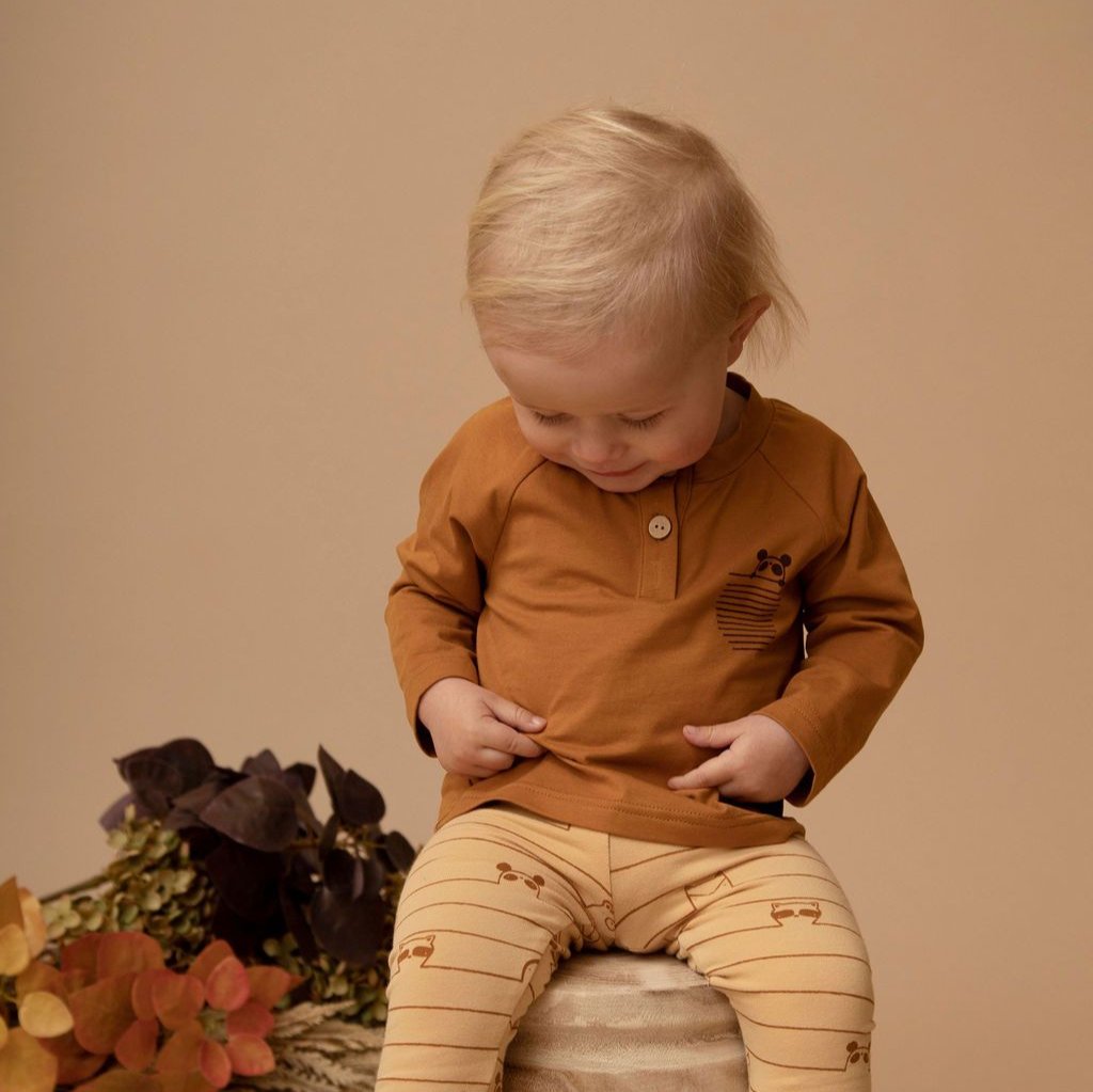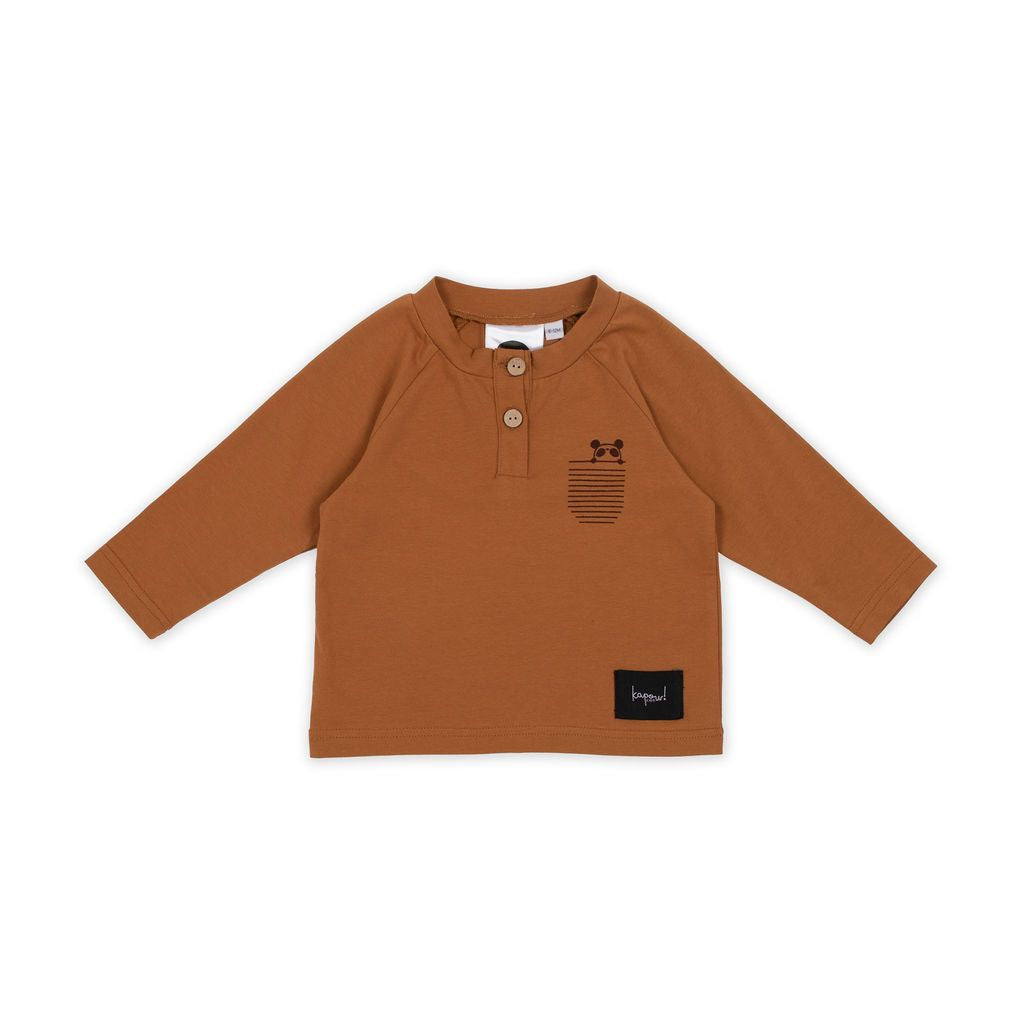 Choc brown jersey long sleeve plain tee with cute “discrupted stripe” panda pocket print at chest