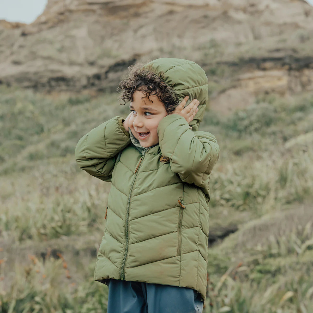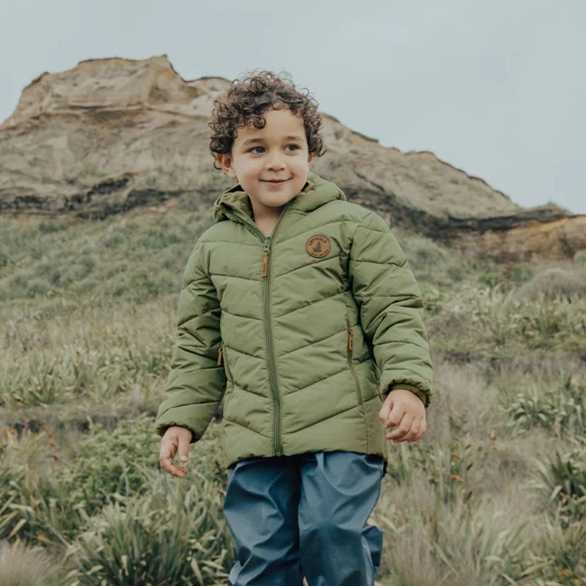 Perfect for young adventurers, the Eco-Puffer features a fleece-lined hood with an elasticated trim for added warmth, elasticated wrist cuffs to lock in heat, and cozy fleece-lined zipped hand pockets to keep hands warm. Designed in New Zealand, it reflects the brand's commitment to both quality and sustainability, making it a standout choice for eco-conscious families.