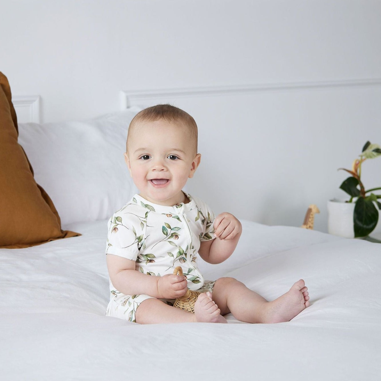 Made from GOTS certified organic cotton, this short-sleeved romper features a reversible cuff on feet, 2-way zipper for fast nappy changes and a zip cover to protect bub's soft skin.
