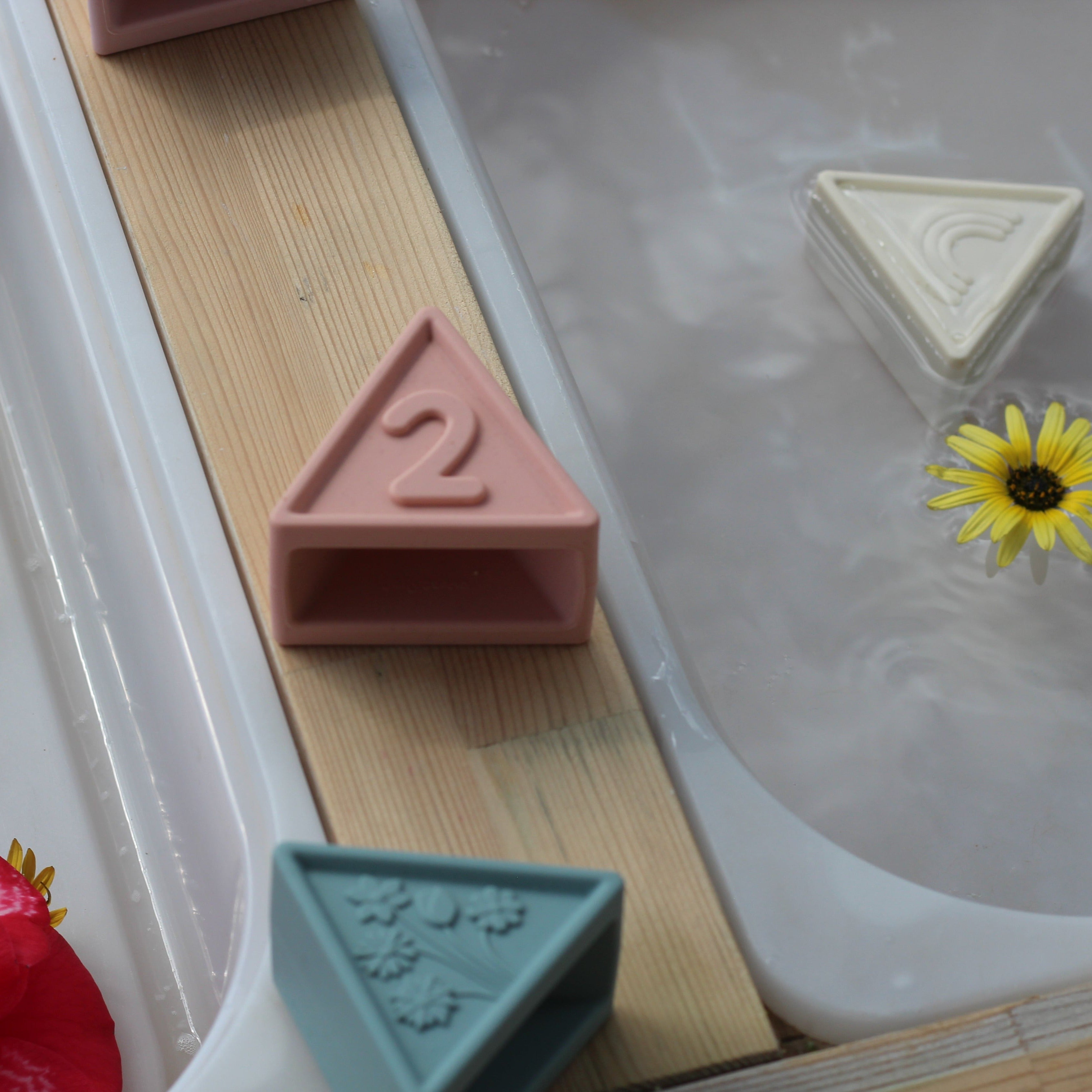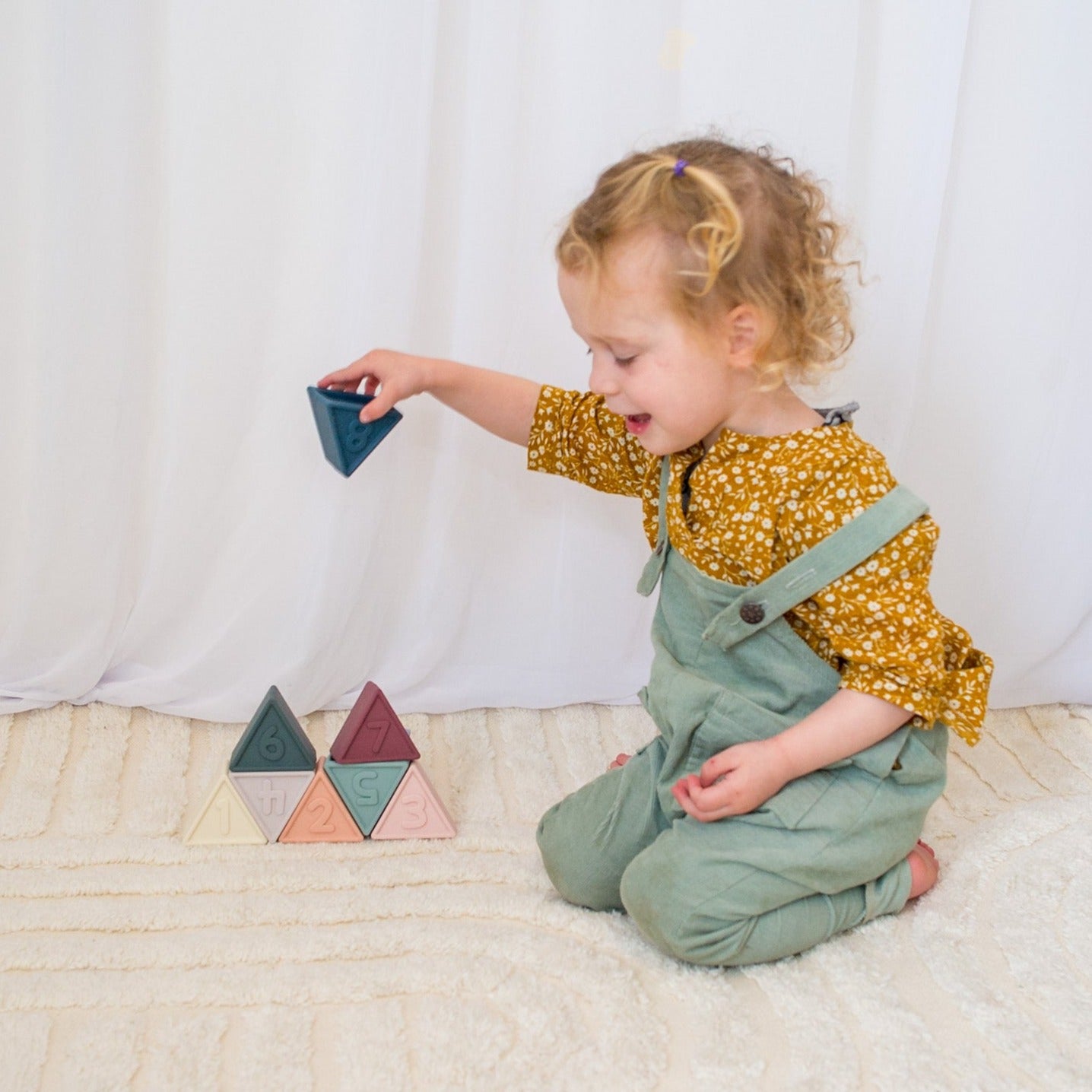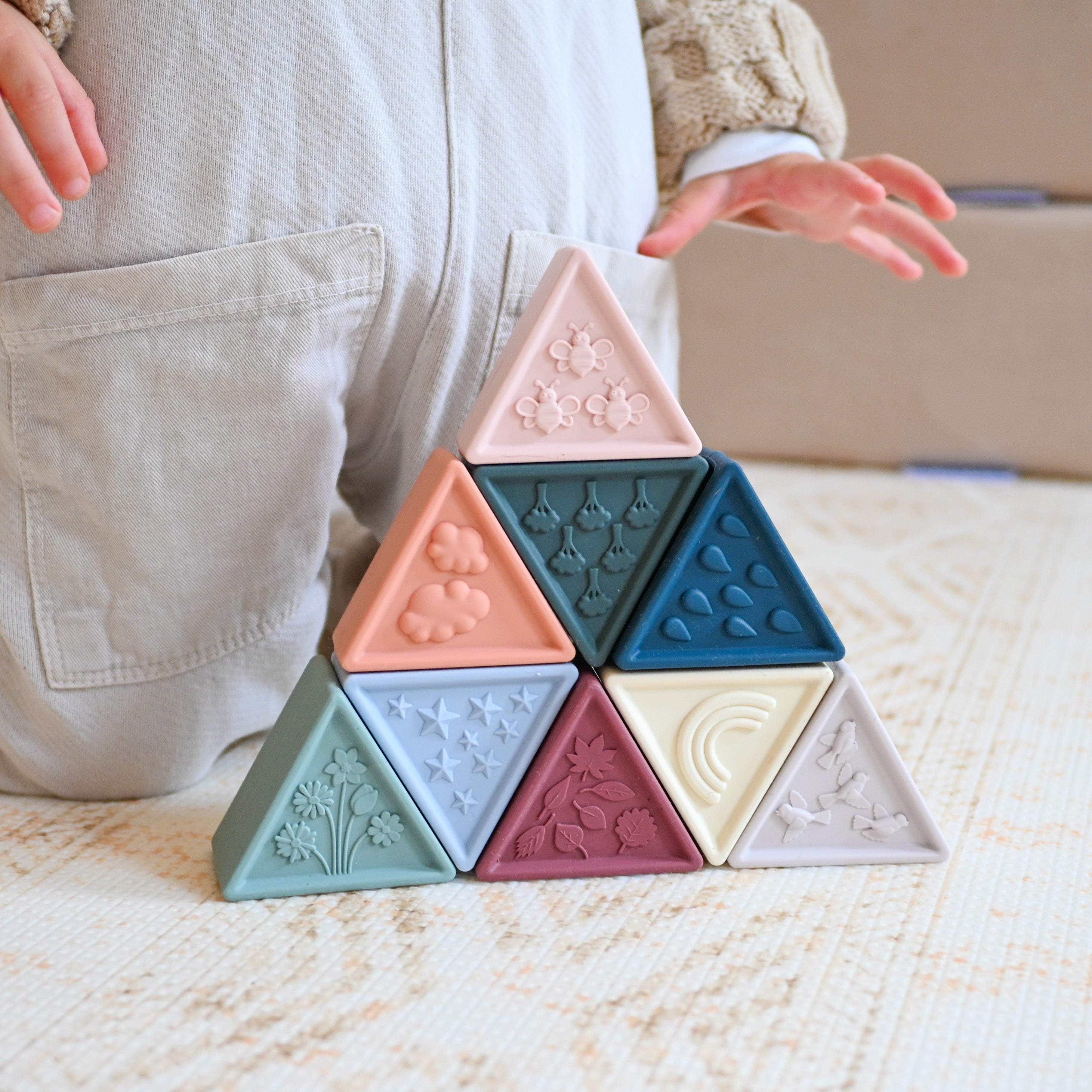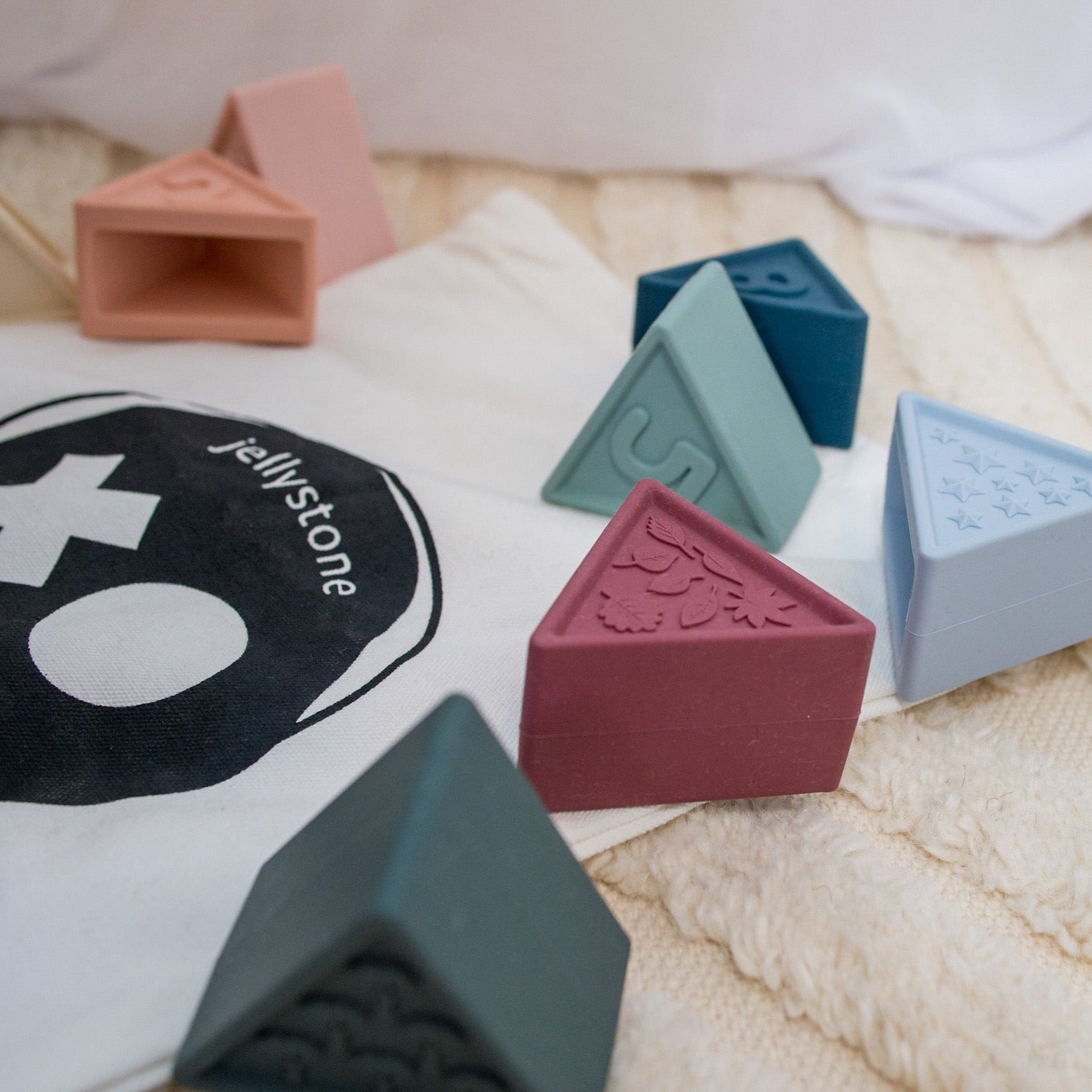 Introducing Jellystone Designs' Triblox! 9 Triangle Blocks made from toxic-free silicone that little ones can use to build, stack, and learn. Perfect for open-ended play, each colourful block features a number and corresponding illustration on the other side for added learning opportunities. Triblox is an excellent way for little ones to channel their own creativity and direct their own play!