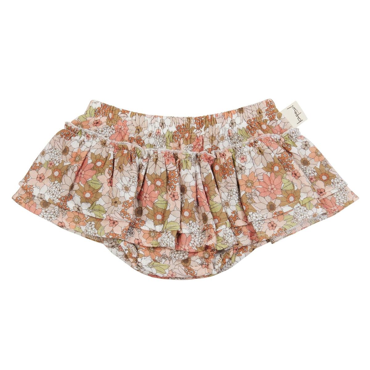 Shine bright in these Bouquet Ruffle Bloomers! Boasting double ruffles and cozy cheesecloth, these bloomers are so cute and comfy! Pair with the Apricot waffle singlet bodysuit for the cutest summer look.Â