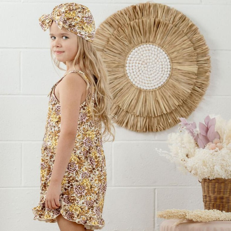 This adorable playsuit features coconut buttons at front placket (non functional), adjustable overall style straps with coconut buttons (functional), and ruffled shorts detail.