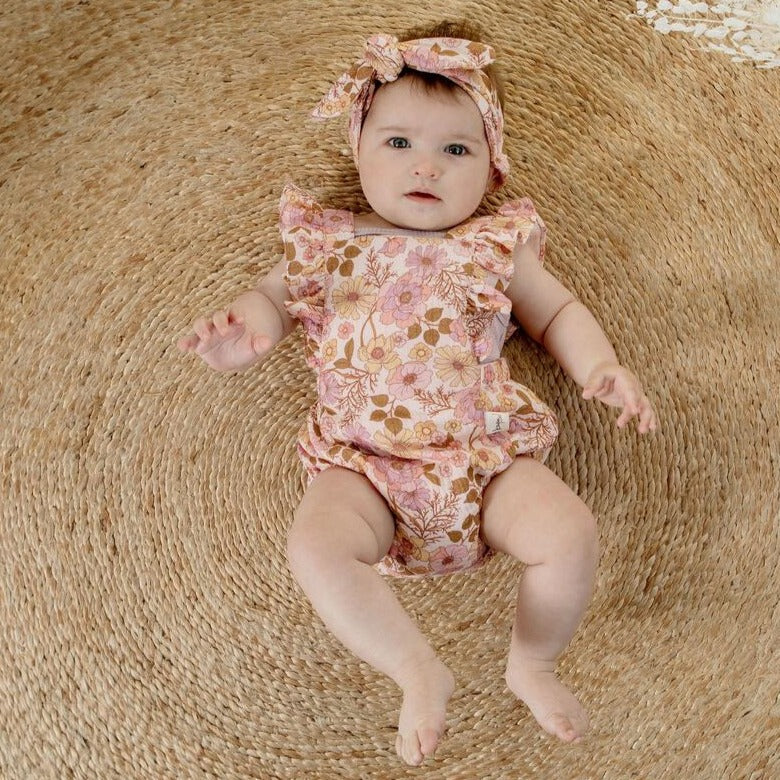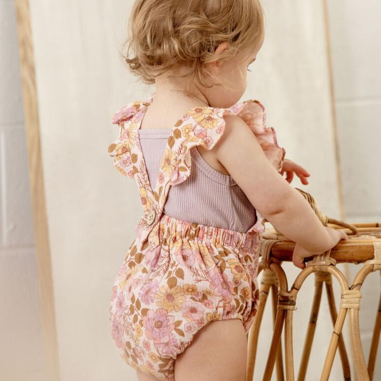 A sweet playsuit with ruffles. Cute to wear on its own, or with a top underneath. Soft elastic waist and overall style cross-over straps at back with single coconut button fastening and three adjustable buttonholes. Snaps at crotch for easy nappy changes.