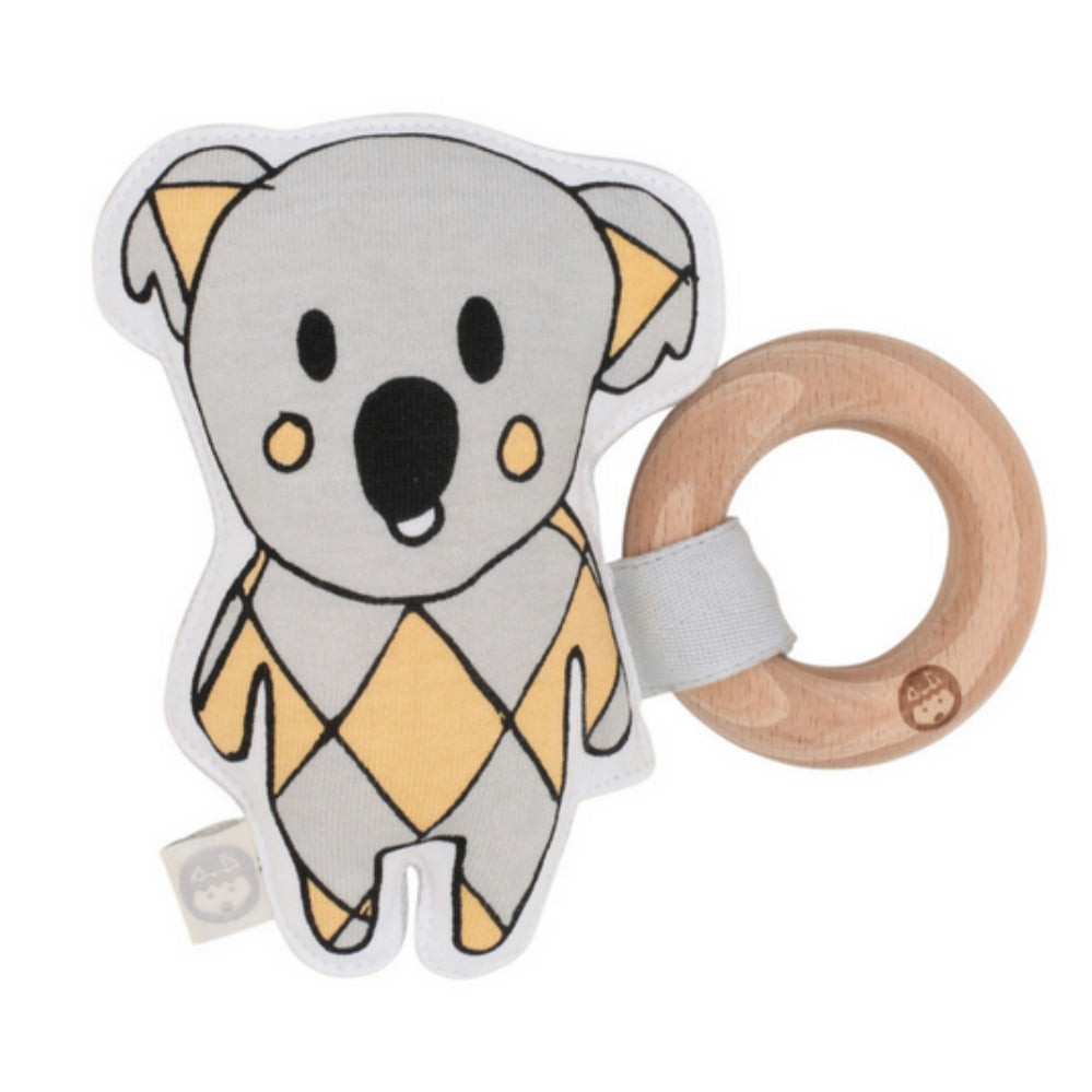 Bright orange and grey koala rattle with grey reverse.