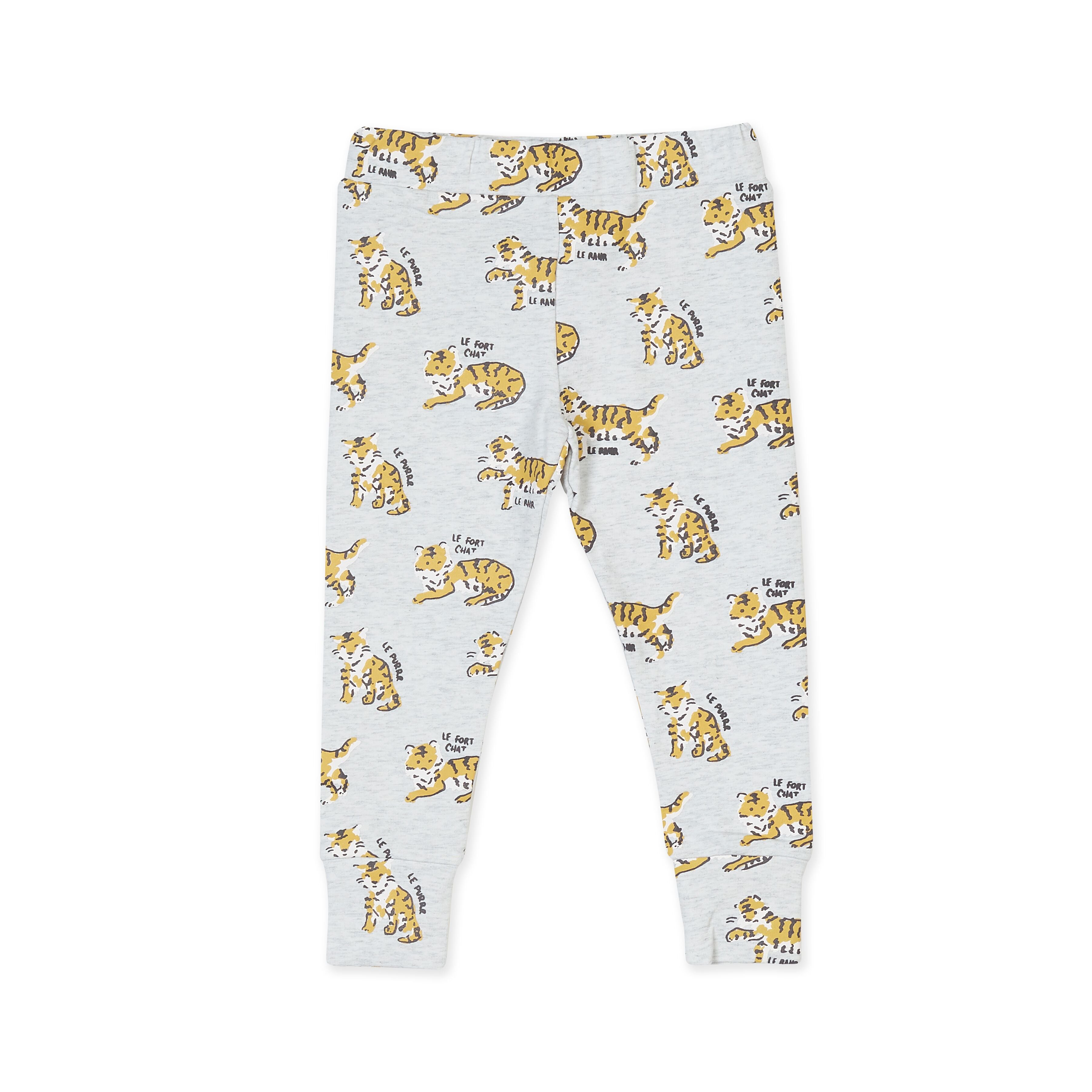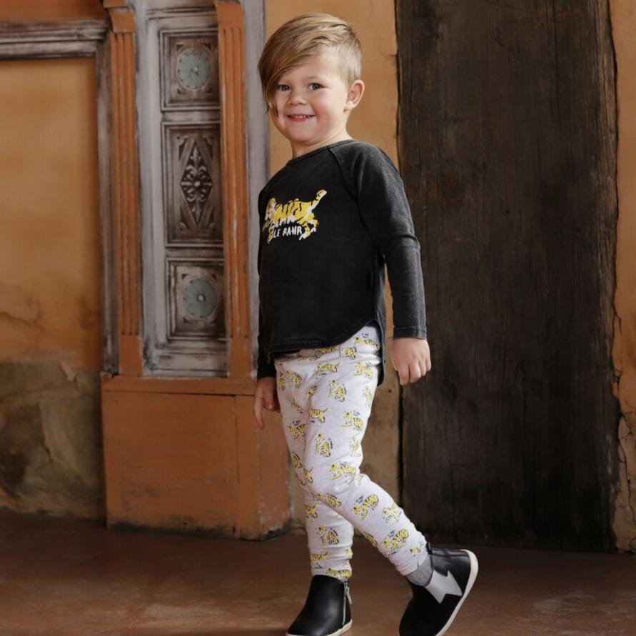 If a French Tiger could talk it would totally say, “Le Rahr”, and “Le Purr” right? Your little Tiger cub will fall in love with this sweet hand drawn Tiger print skinny trackies. These pants are just like leggings but made from tracksuit fabric. They feature a cool back pocket and elasticised waist. Pair these pants with the matching Le Rahr Yardage Sweater for double the cuteness or with the Le Rahr Placement LS t-shirt.