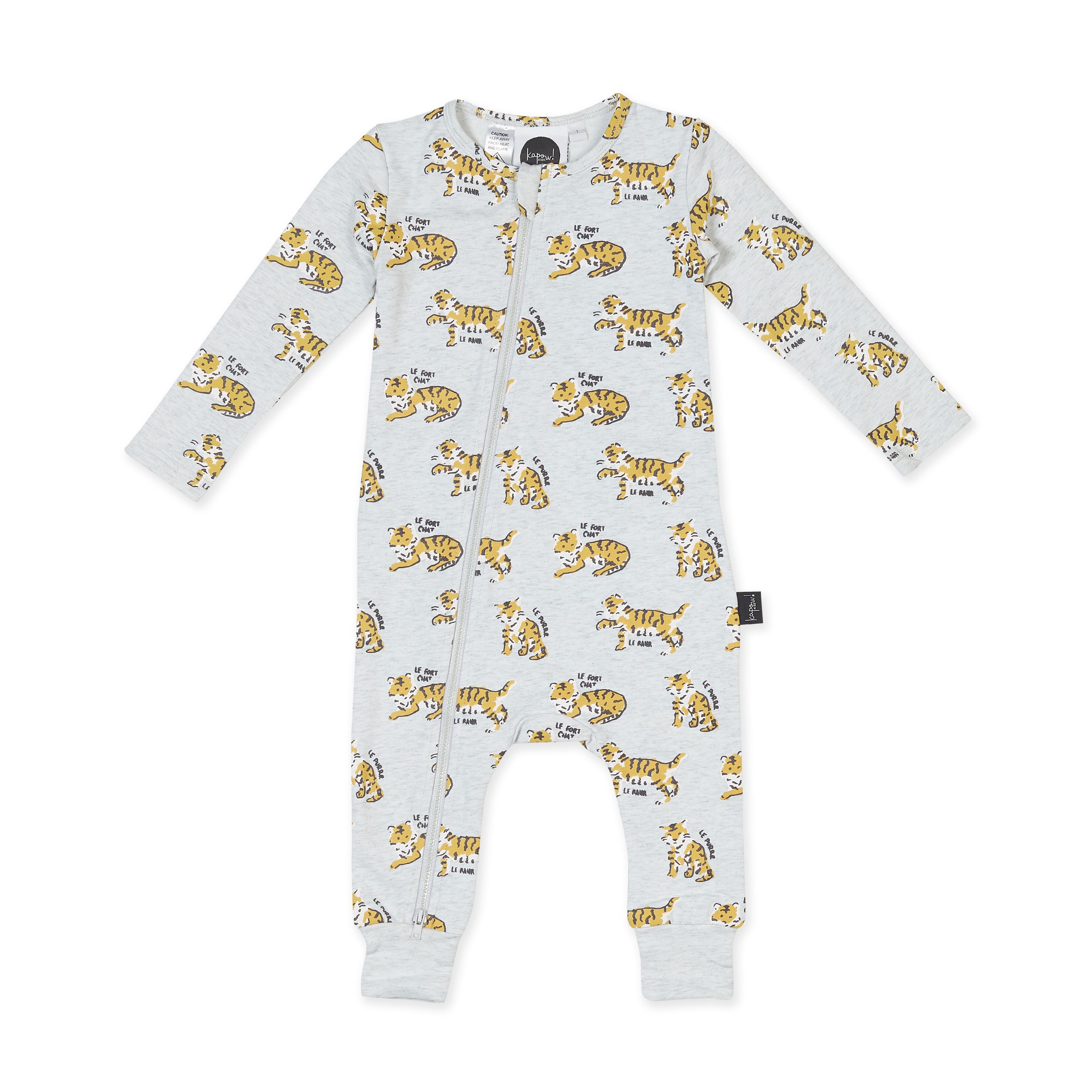 If a French Tiger could talk it would totally say, “Le Rahr”, and “Le Purr” right? This sweet hand drawn Tiger print Zip onesie makes a cool outfit for your Tiger cub. The zip is an awesome two-way zip which is super practical for nappy changing. Plus the zip is very high quality and sturdy. We are all about designing clothes that are made to last. This baby onesie is a warmer weight (French terry) but they are made with some spandex so they are also stretchy which makes it super comfy for little ones.