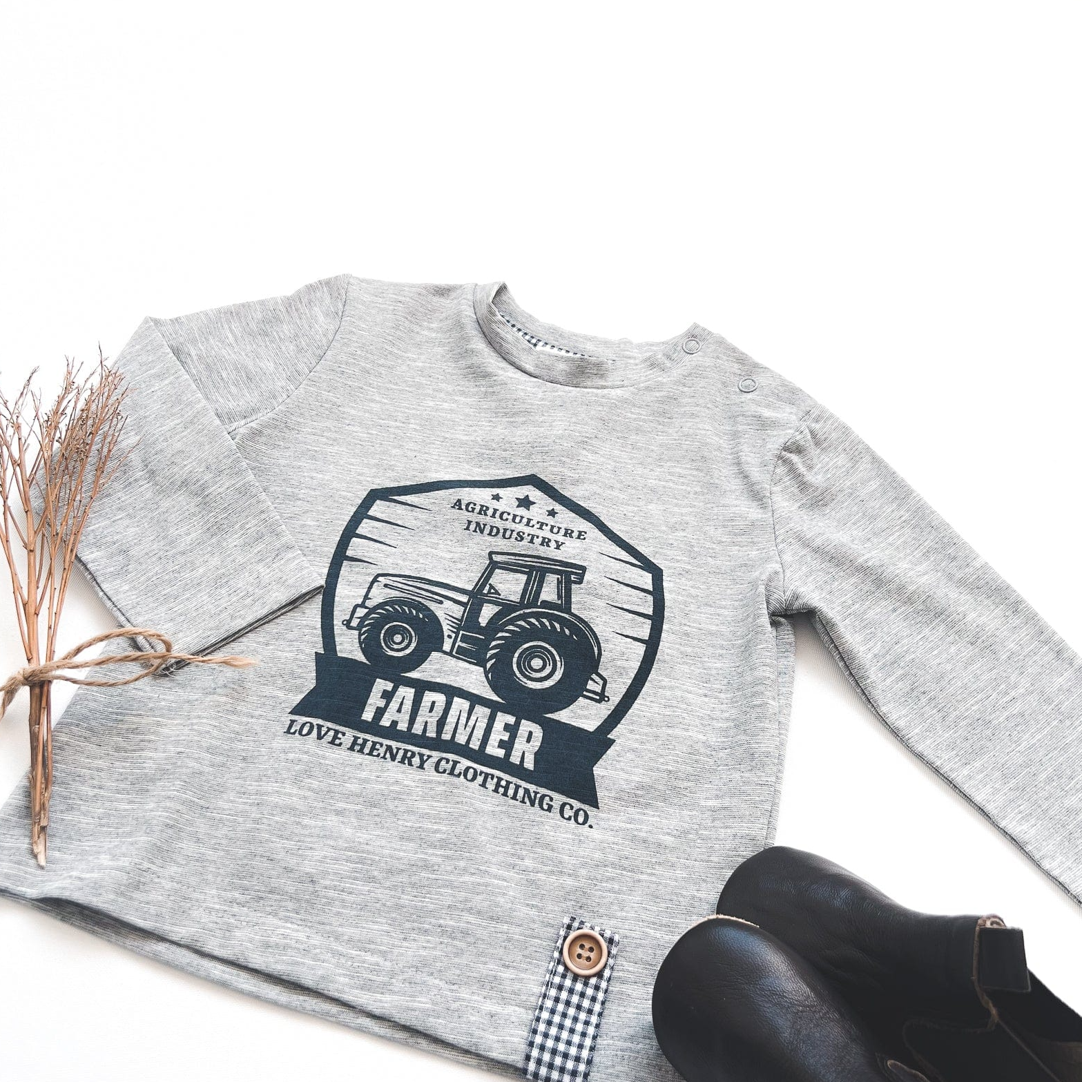 Get your little farmer ready to roll in style with Love Henry's grey marl textured cotton knit tee featuring a tractor print on the front. Grab this tee for your mini farmer and watch him tractor his way to cuteness overload.