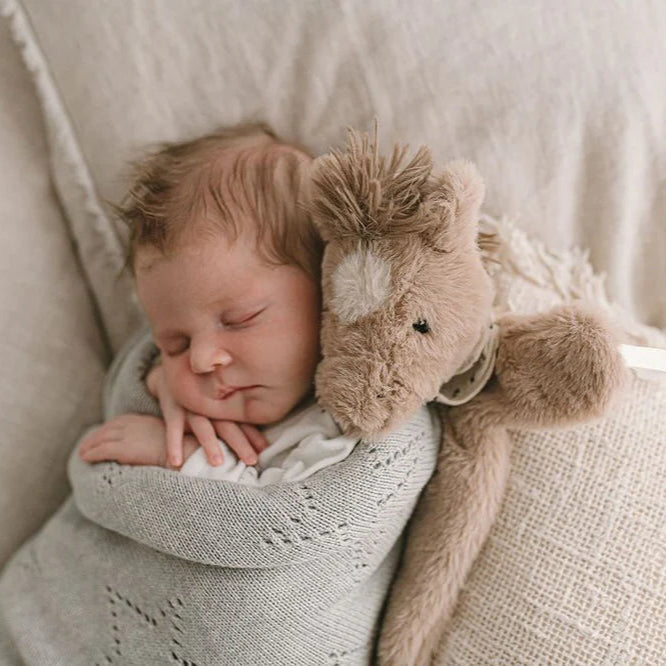 Meet Harvey the Horse, the ultimate snuggle buddy and baby sleep aid in one! This clever Hoochy Coochie Comforter is a soft toy, hand puppet, and dummy holder designed to soothe, entertain, and comfort your little one from birth.