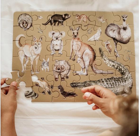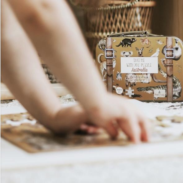 Our Australia "Take Me With You" Puzzle is a stunning 36 piece jigsaw puzzle, packaged in the sweetest mini suitcase with a durable metal handle and latch. The puzzle pieces themselves are made of recycled materials and will be found inside a luxe paper bag to ensure this is another earth-friendly, ZERO plastic product.
