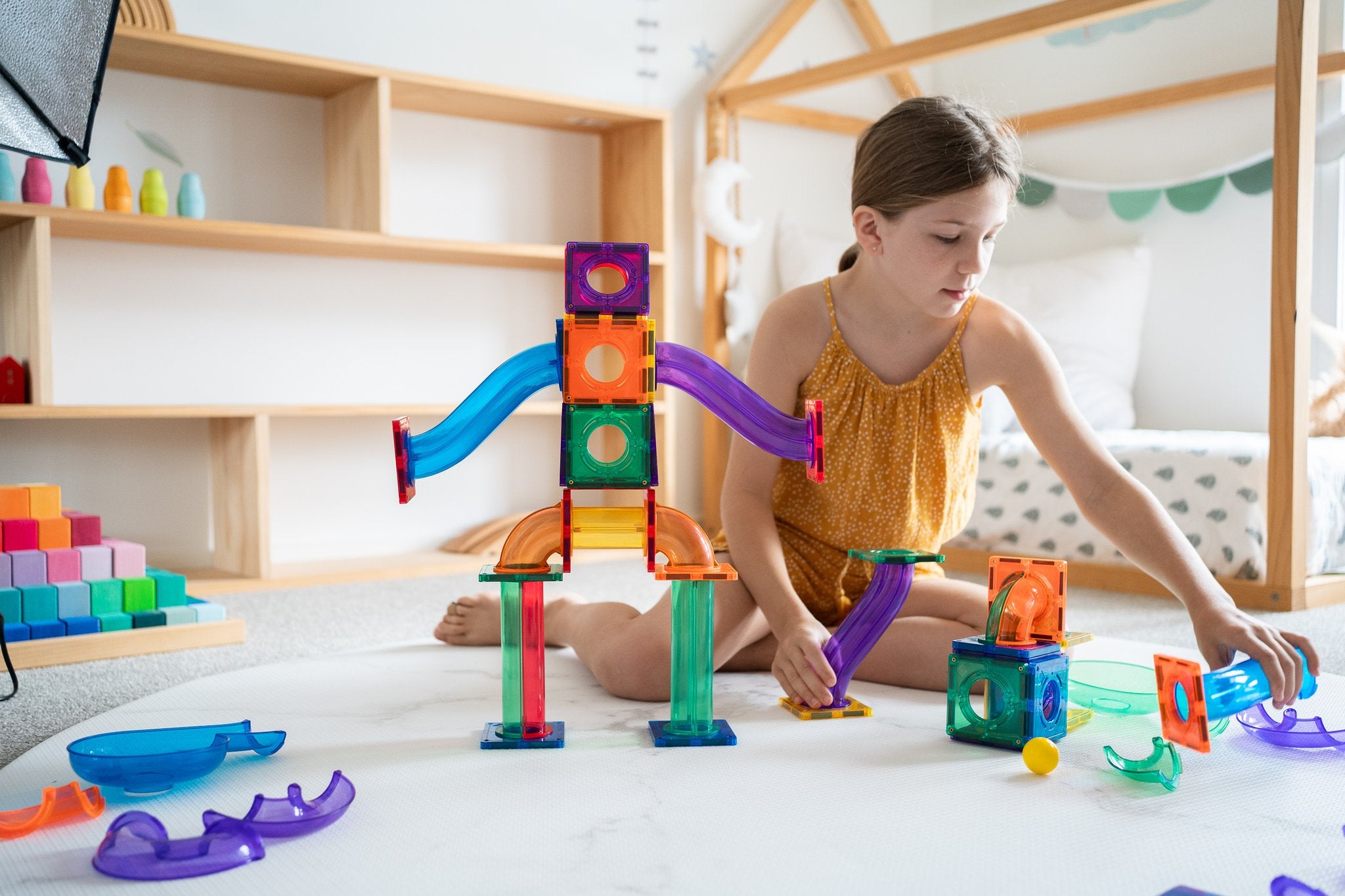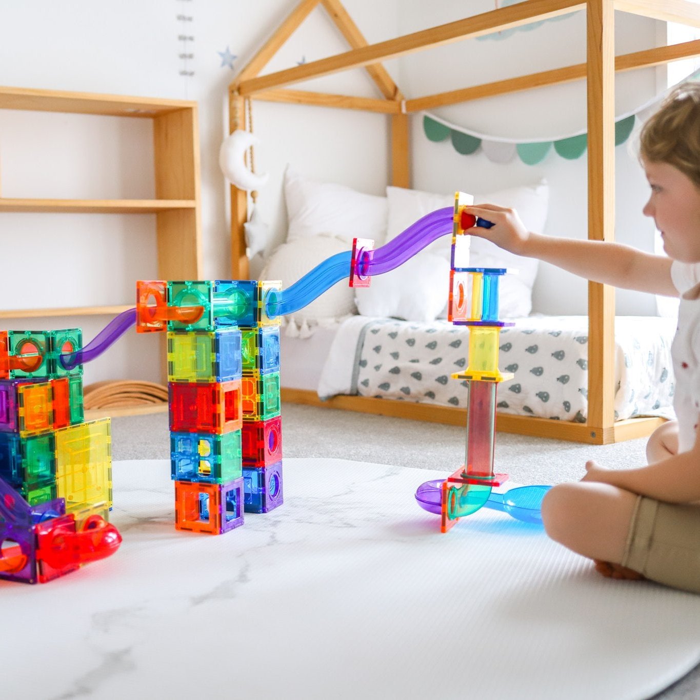 This 84 piece sets includes everything you need to build a complete run or pair with magnetic tiles to create massive ball mazes.