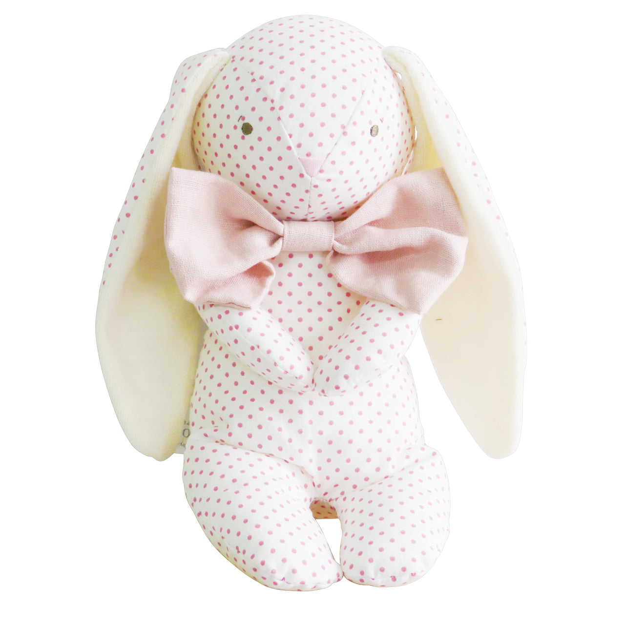 A gorgeous floppy bunny toy made from a beautiful linen cotton fabric with pink spot & bow tie. Suitable from 3 months.