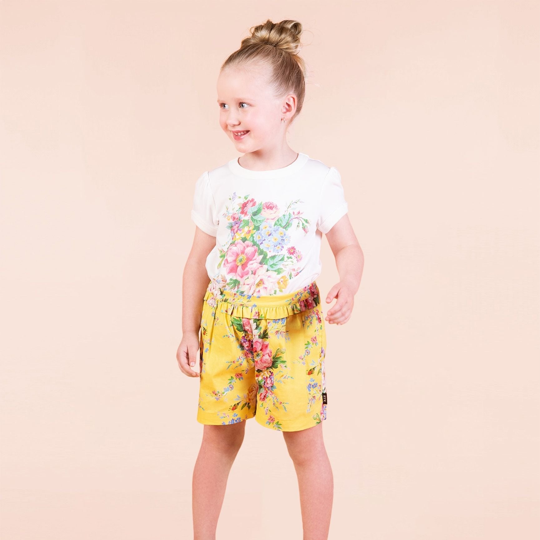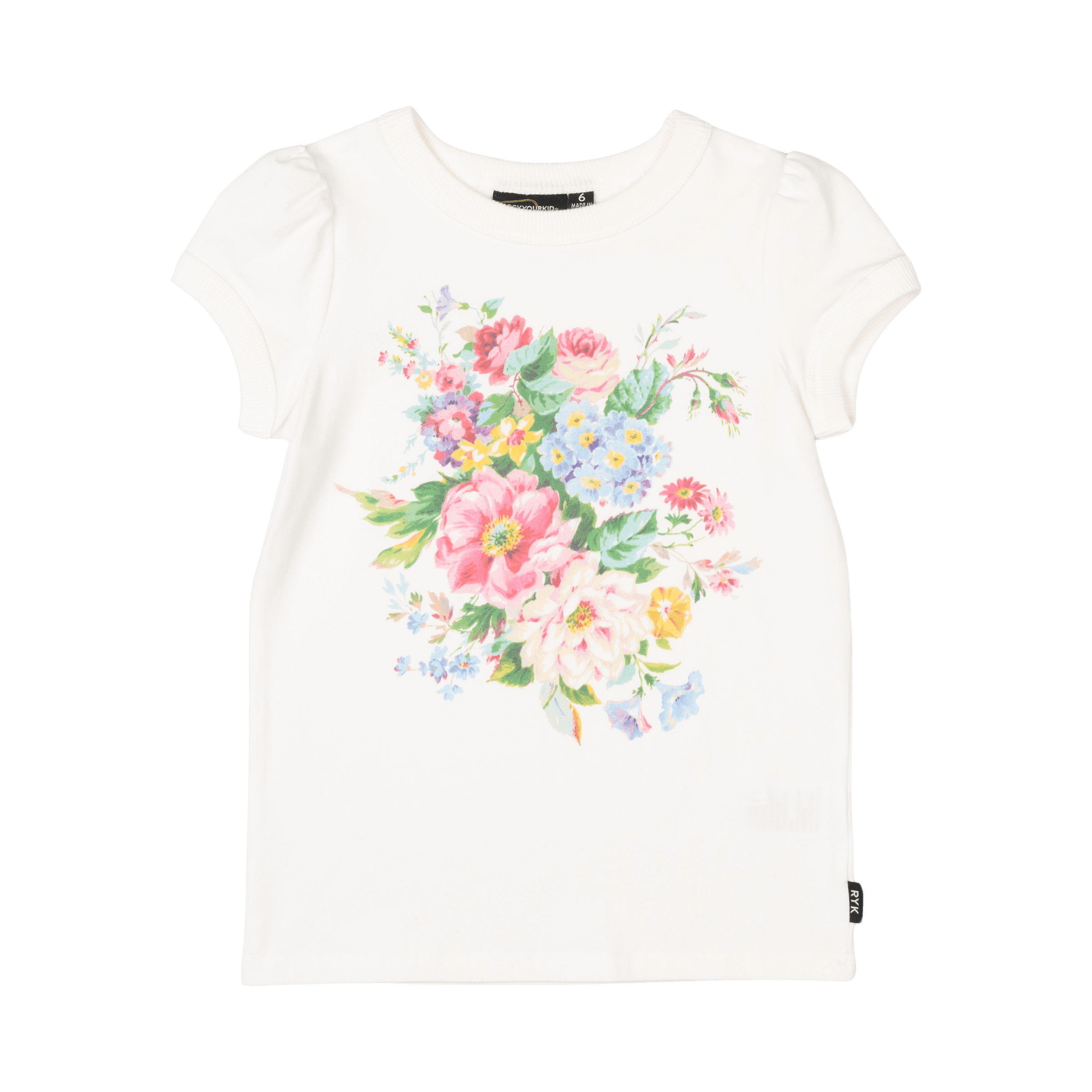 Step out in style with Rock Your Baby's Beatrice T-Shirt! This cotton jersey tee features puff short sleeves, cream ribbing, and a floral print on a cream base, adding a delicate touch to any outfit.