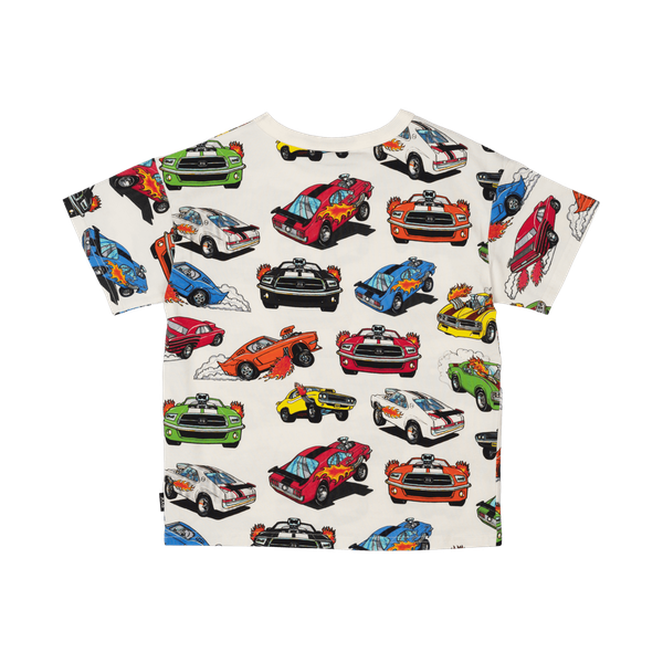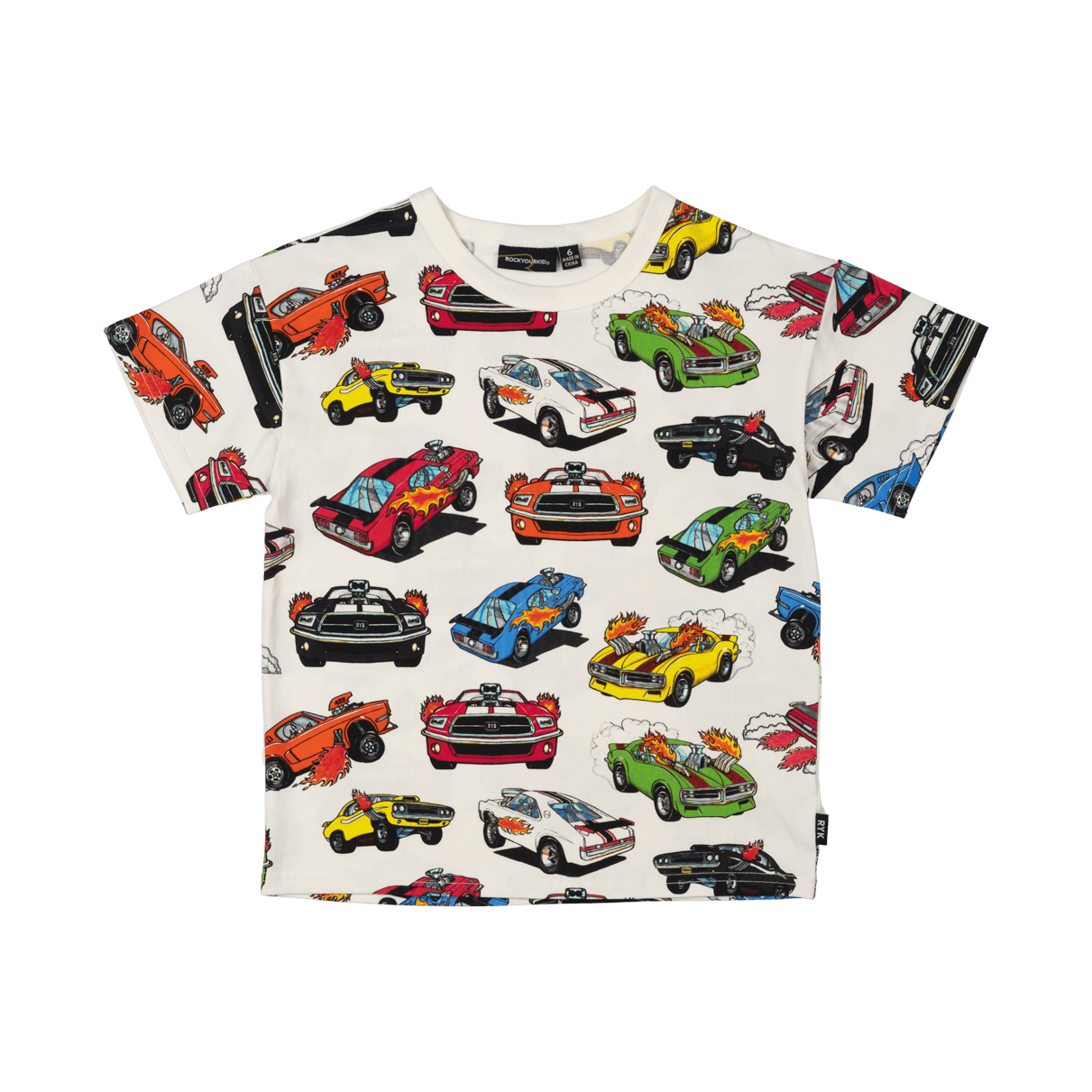 Add a touch of retro cool to your wardrobe with Rock Your Baby's Cars T-Shirt! This comfy tee boasts a boxy fit and drop shoulder sleeves for an effortlessly cool look. Featuring a colourful pattern of vintage cars on a soft cream base, this cotton and elastane jersey tee is sure to add a fun pop of colour to any occasion!
