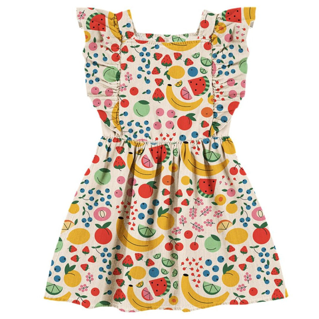 Introducing our Farmers Market Dress! Made from a soft cotton slub, this all-over fruit printed dress features a square neckline with shoulder frills, a gathered skirt and cream back buttons.