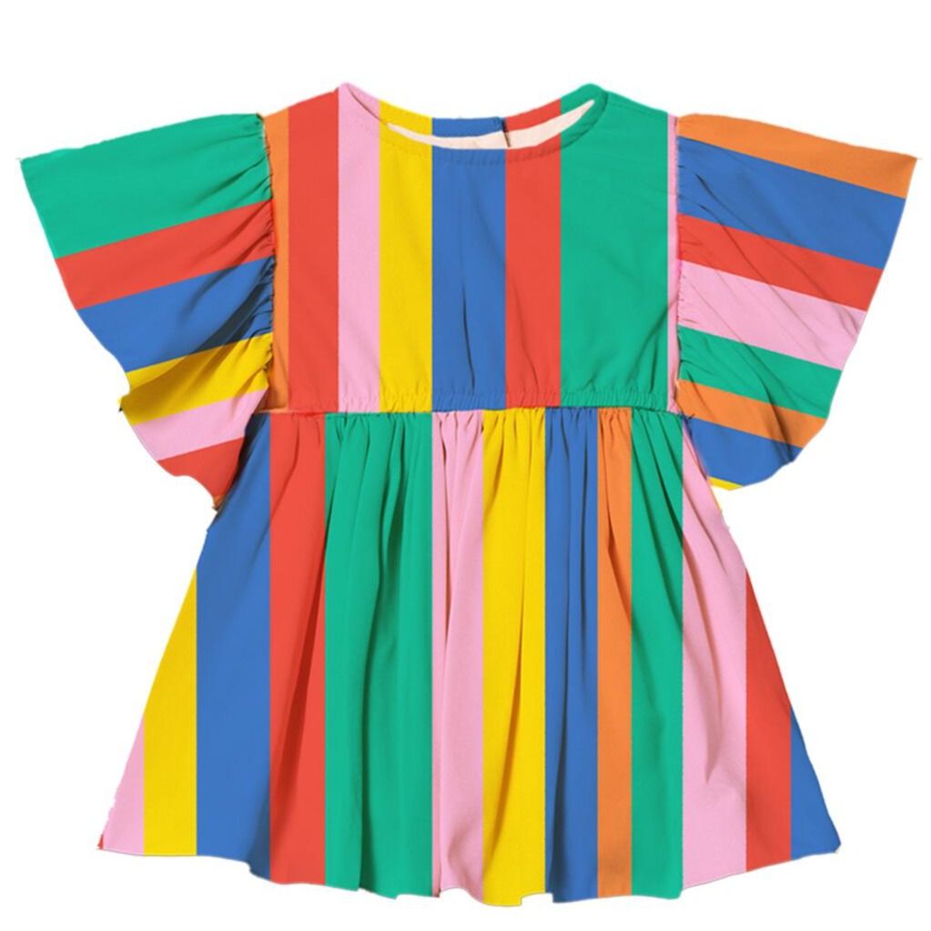Introducing our Rainbow Stripes Dress! Made from a soft cotton slub, this rainbow striped dress features frill sleeves with an elasticated waist and gathered skirting. Features a back zip closure and front side pockets.Â