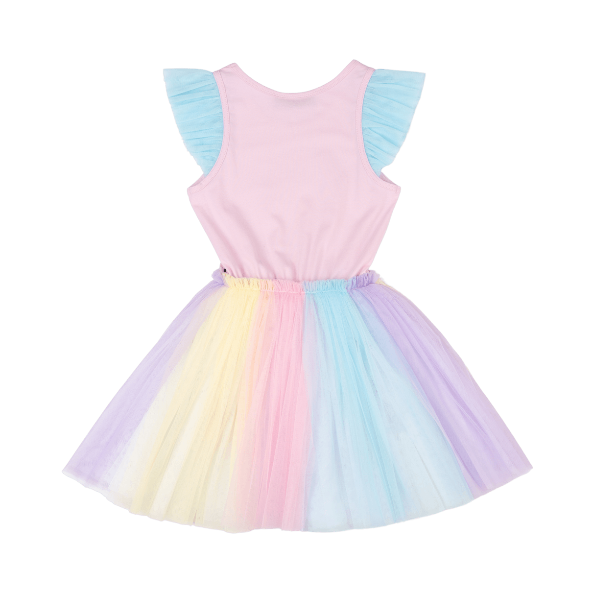 Twirl into magic with Rock Your Baby's girls Unicorn Rainbow Singlet Dress! Featuring a pink cotton and elastane jersey bodice adorned in a design of a colourful unicorn, this sweet girl dress is fitted with contrast blue tulle short sleeves. The tulle skirt features blue, purple, pink, and yellow panels, adding a touch of rainbow fun to an enchanting look!