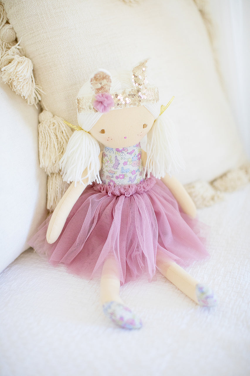 Sienna is a cute 50cm doll with cute yarn piggy tails and a sequin bunny crown. Her tulle tutu is removable, making playtime dress ups extra fun!