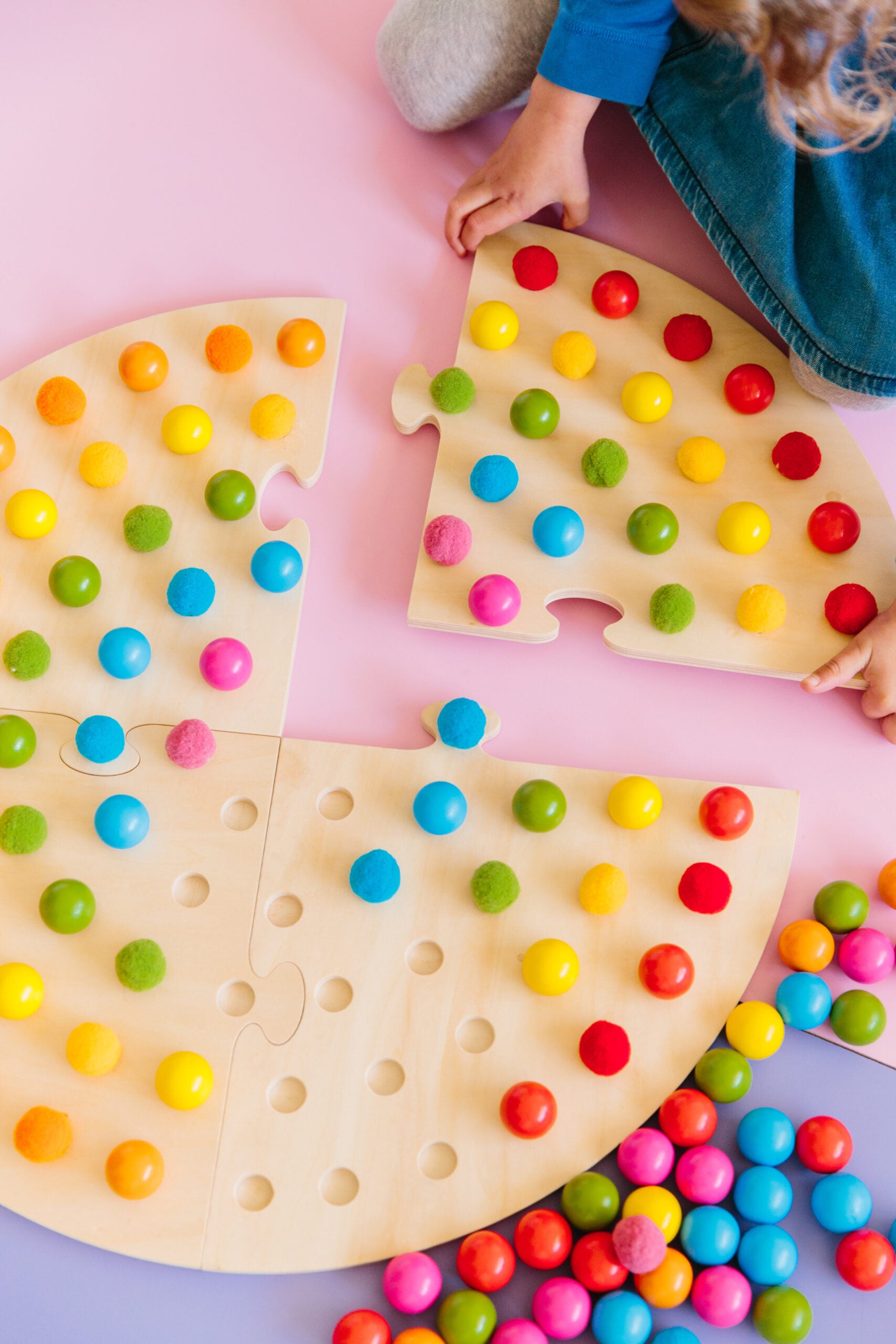 My Rainbow Globe features beautiful bright colours and so many learning opportunities all rolled into one fantastic toy. A puzzle and sorting toy combined, children can use their creativity to sort colours, or design patterns filling up the puzzle with their favourite coloured wooden or felt balls, both of which are included in this set. This one is the perfect aid for recognising colours and developing those fine motor skills. As children become more confident the Rainbow globe can be used to engage children to develop early math skills such as practice counting, pattern making, fractions and other basic mathematical concepts. The set includes 90 wooden balls, 90 felt balls and 4 large wooden puzzle piece bases.