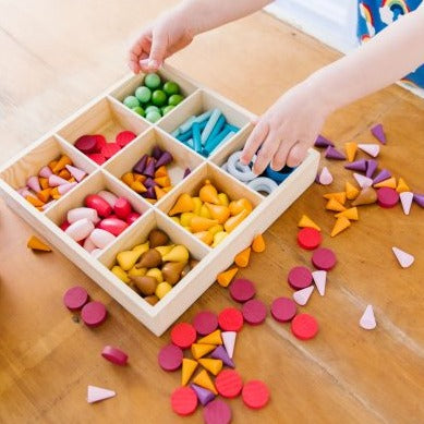 Looking for a toy that is completely open-ended, encourages mindfulness, and is perfect on its own but also combines beautifully with other toys? If you answered ‘yes’, then this is for you. Made up of high quality, wooden cones, rods, rings, balls, and other small shapes, painted in a range of beautifully contrasting colours, this set can be used for pattern making, colour and shape sorting, or as props in imaginary small worlds for play.
