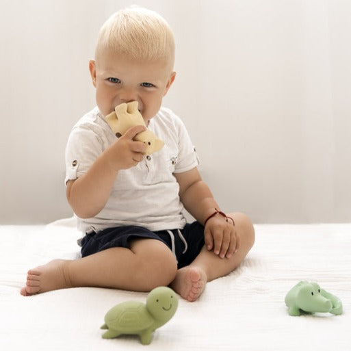 Made from sustainable natural rubber from the hevea tree tree grown in Sri Lanka, My First Ocean Buddies are biodegradable and durable.