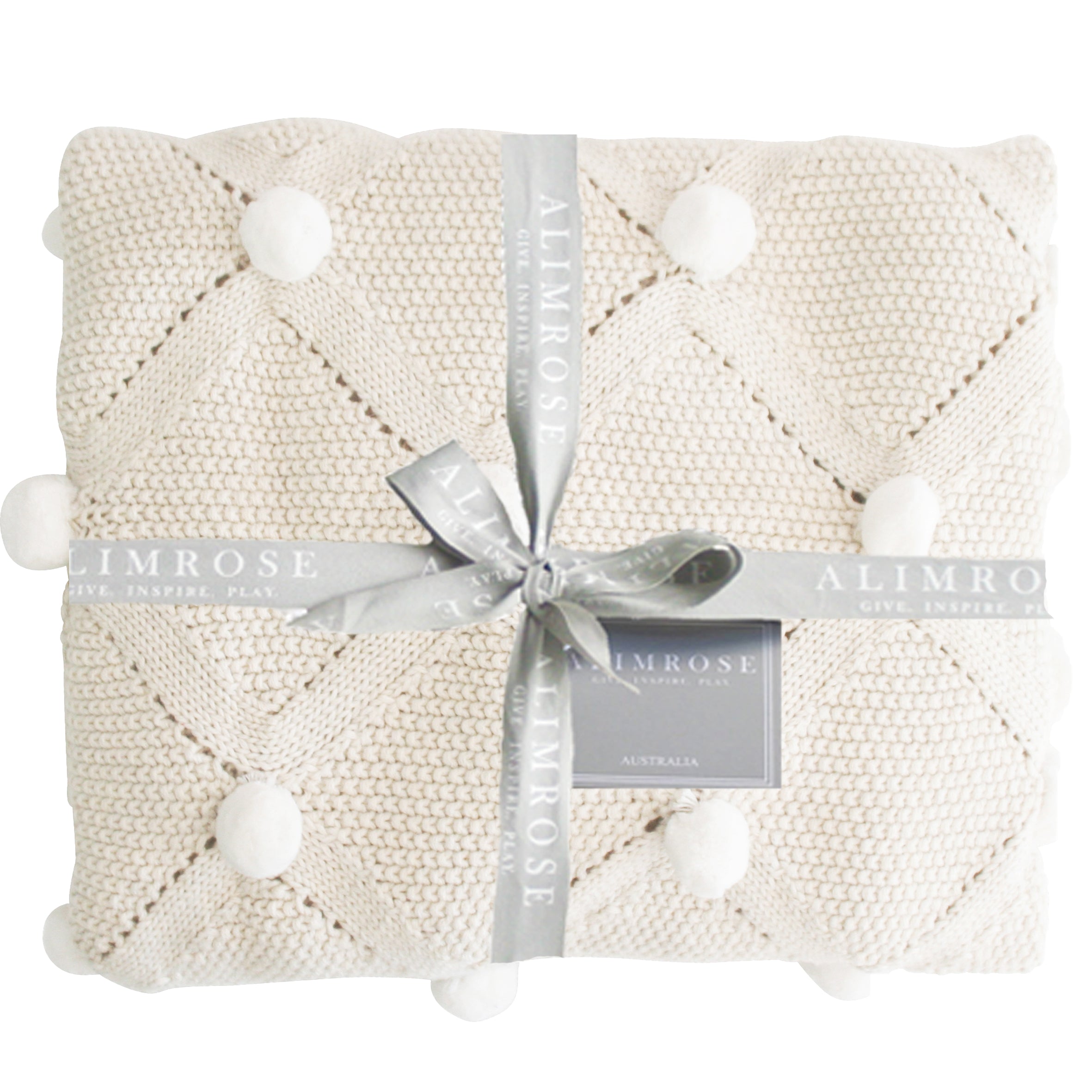 Gorgeous 100% cotton knit baby blanket featuring little pom poms. Super soft and super snuggly!