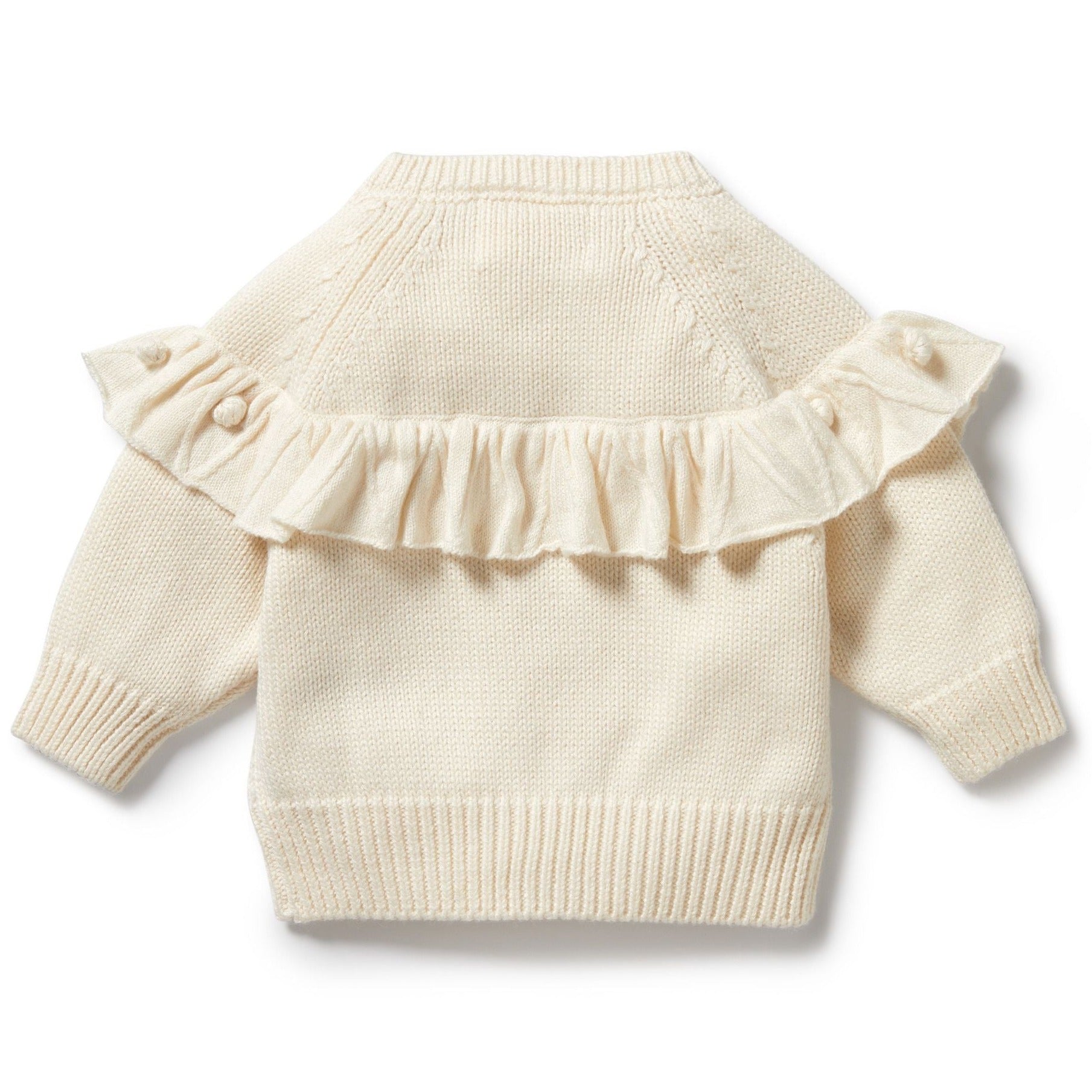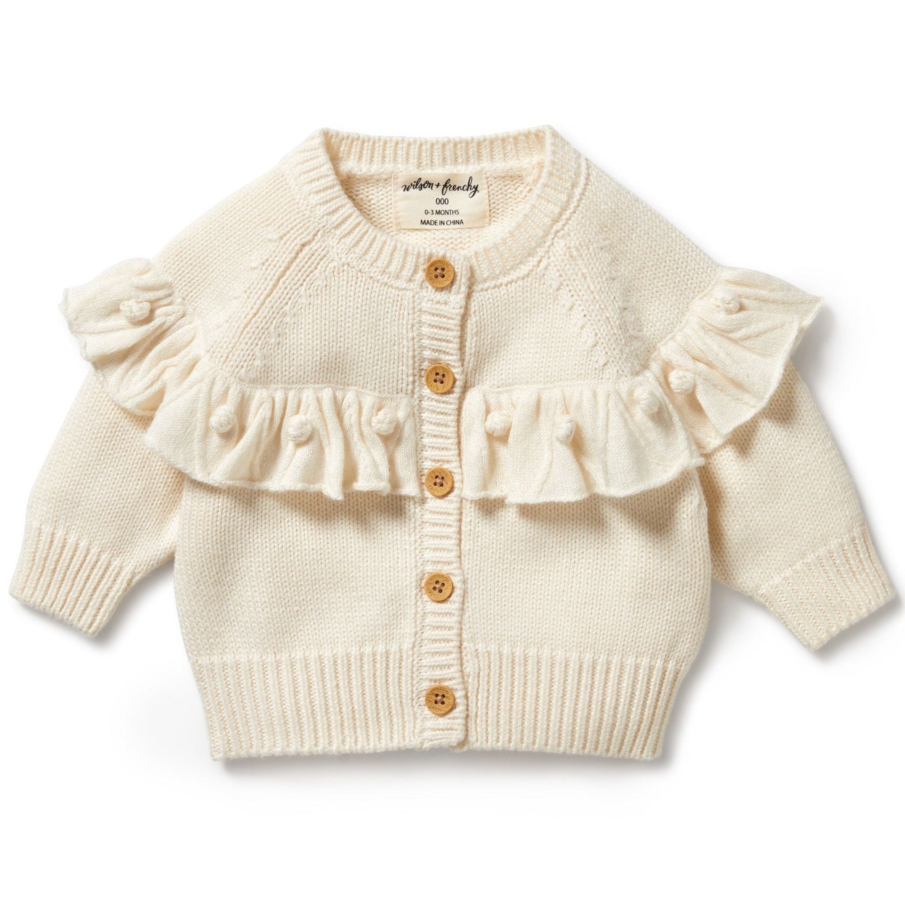 An heirloom piece designed to be passed down, this luxurious knitted ruffle cardigan features a beautiful ruffle detail with baubles. Made from a beautiful blend of Cotton, Bamboo and Wool it's a style you'll want in every colour!