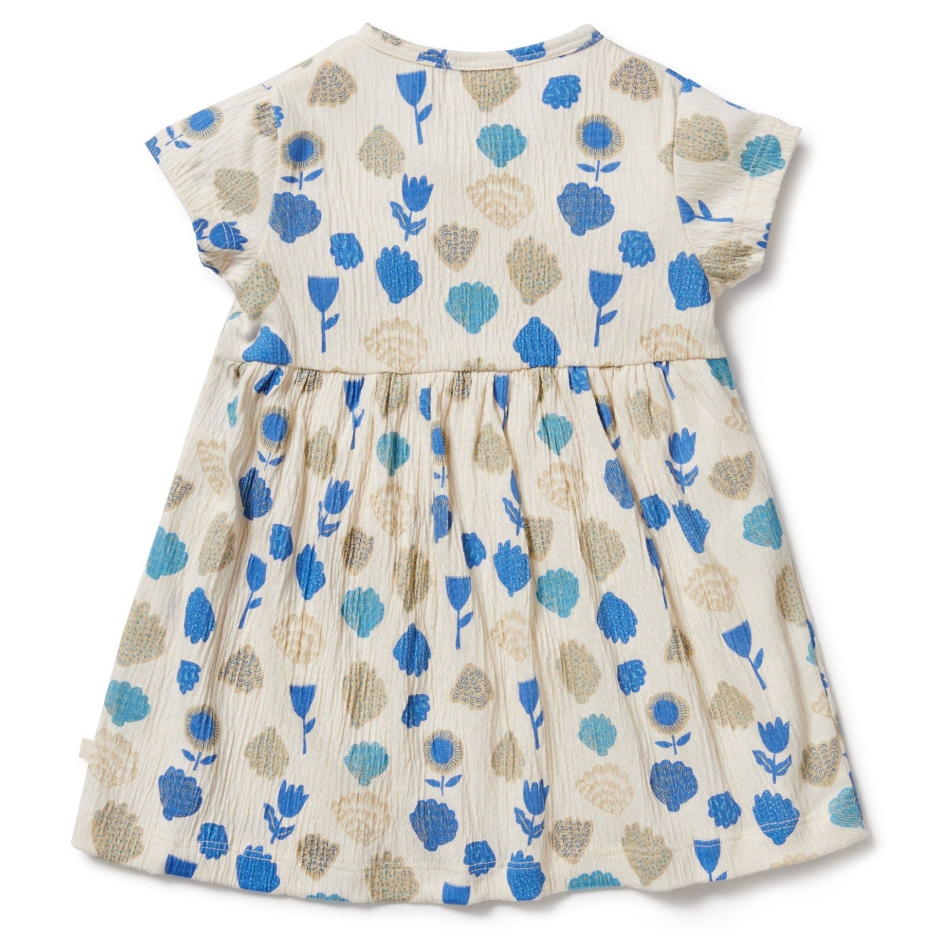 Made from beautiful crinkle cotton, this summer dress is perfect for those sunny and warm days. Mid-length, it features a gathered waistline and, button-through front opening for easy dressing and cap sleeves.